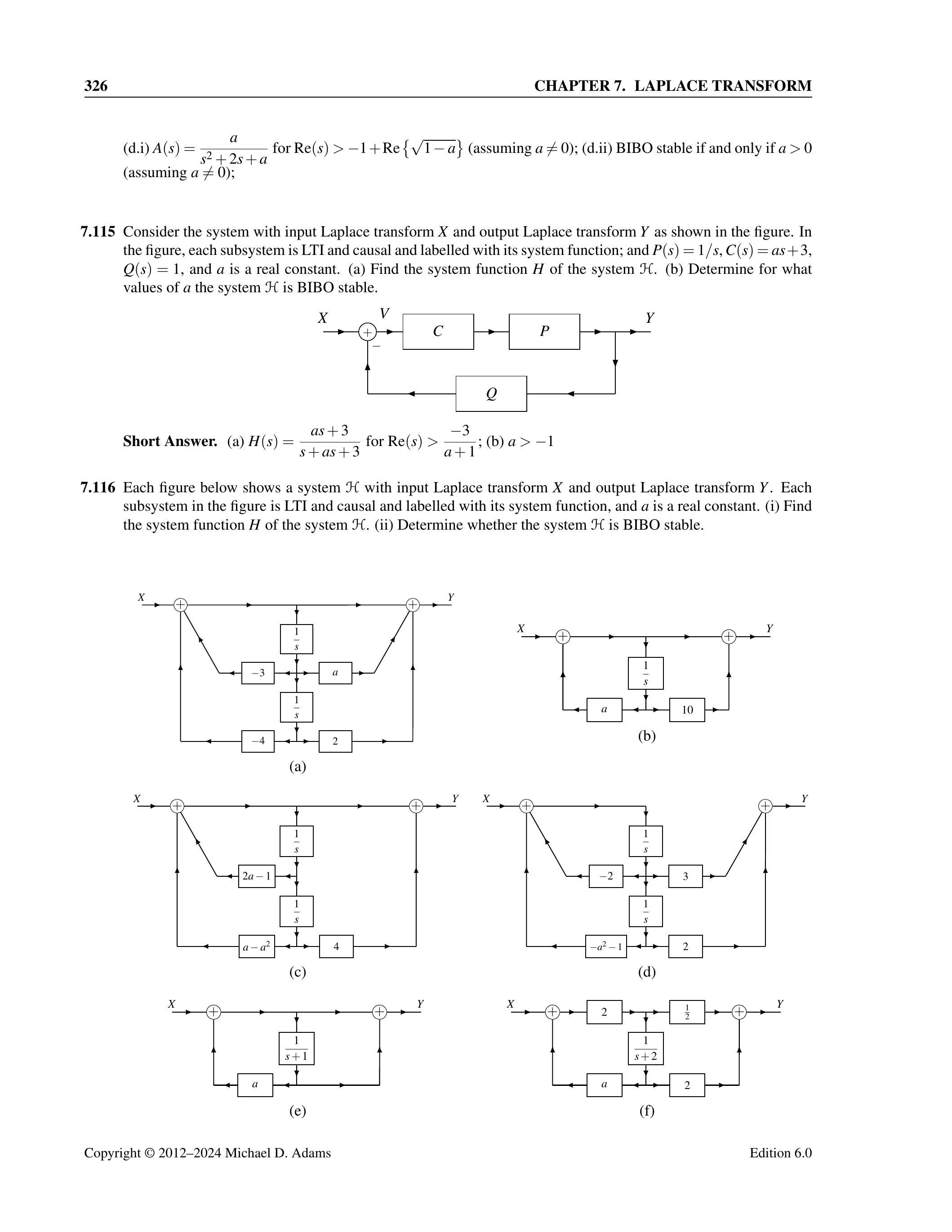 7.116 下列各图显示系统 \(\mathfrak{H}\),输入为 \(X\) 的拉普拉斯变换,输出为 \(Y\) 的拉普拉斯变换。图中每个子系统都是因果 LTI 系统,并标注了系统函数,\(a\) 为实常数。