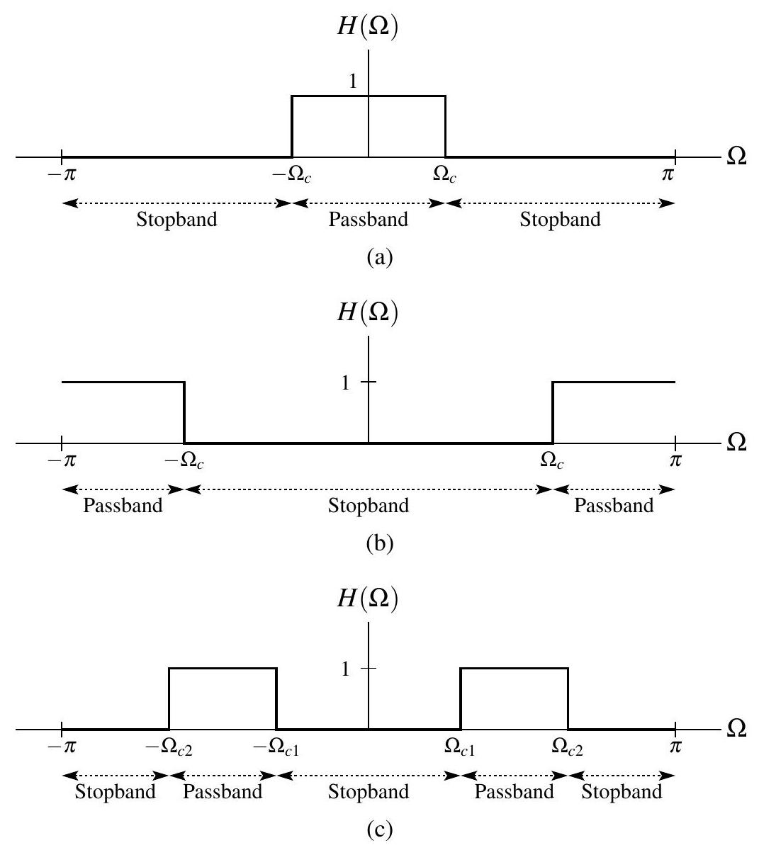 图 10.5:(a)理想低通滤波器,(b)理想高通滤波器,(c)理想带通滤波器的频率响应。