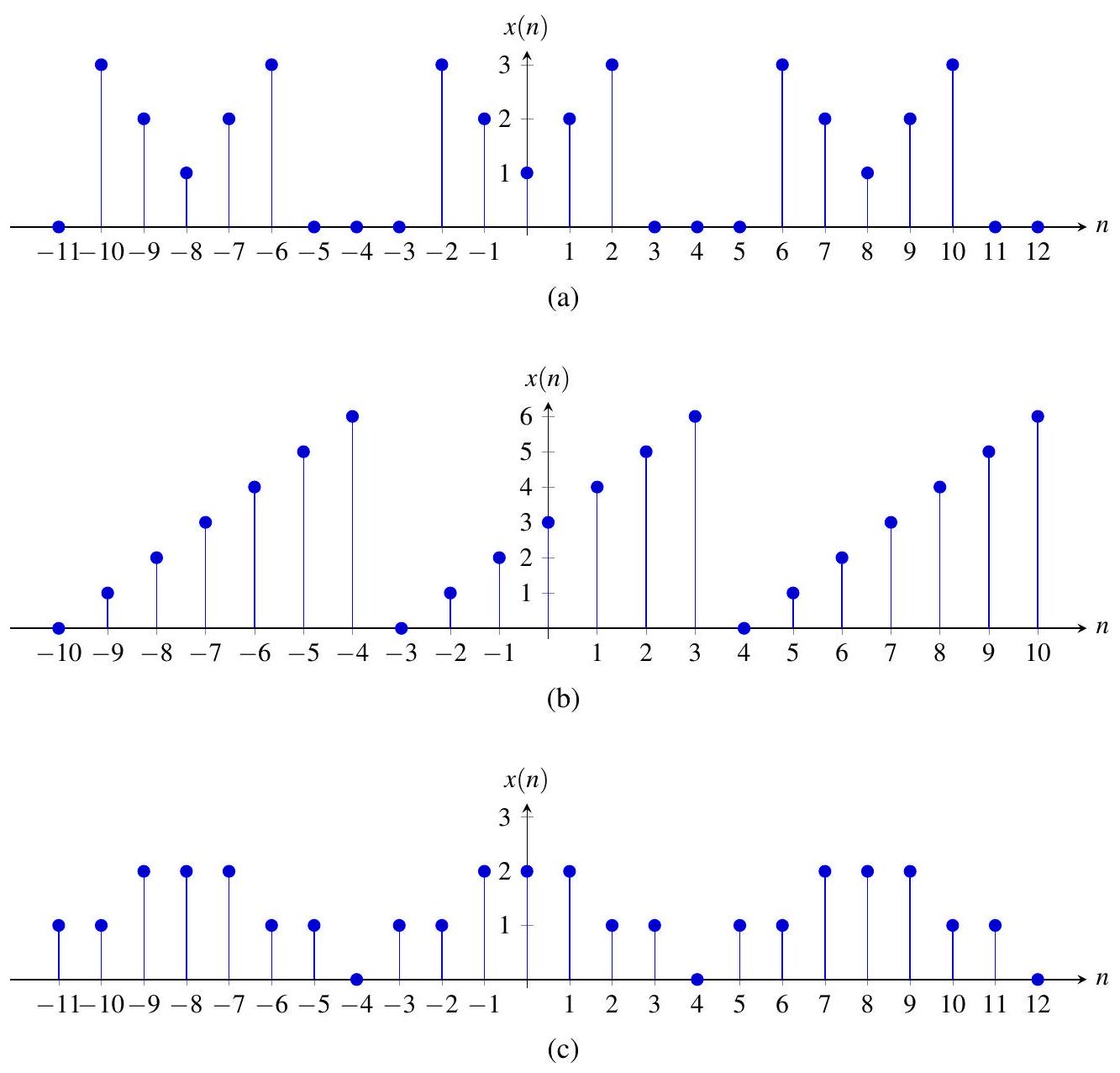 10.2 对下列图示的每个周期序列 \(x\),求对应的傅里叶级数系数序列 \(a\)。每幅图中显示的样本数为周期的整数倍。如有必要,可使用傅里叶级数性质。[提示:对 (c) 部分,可使用练习 10.101 的结果。]