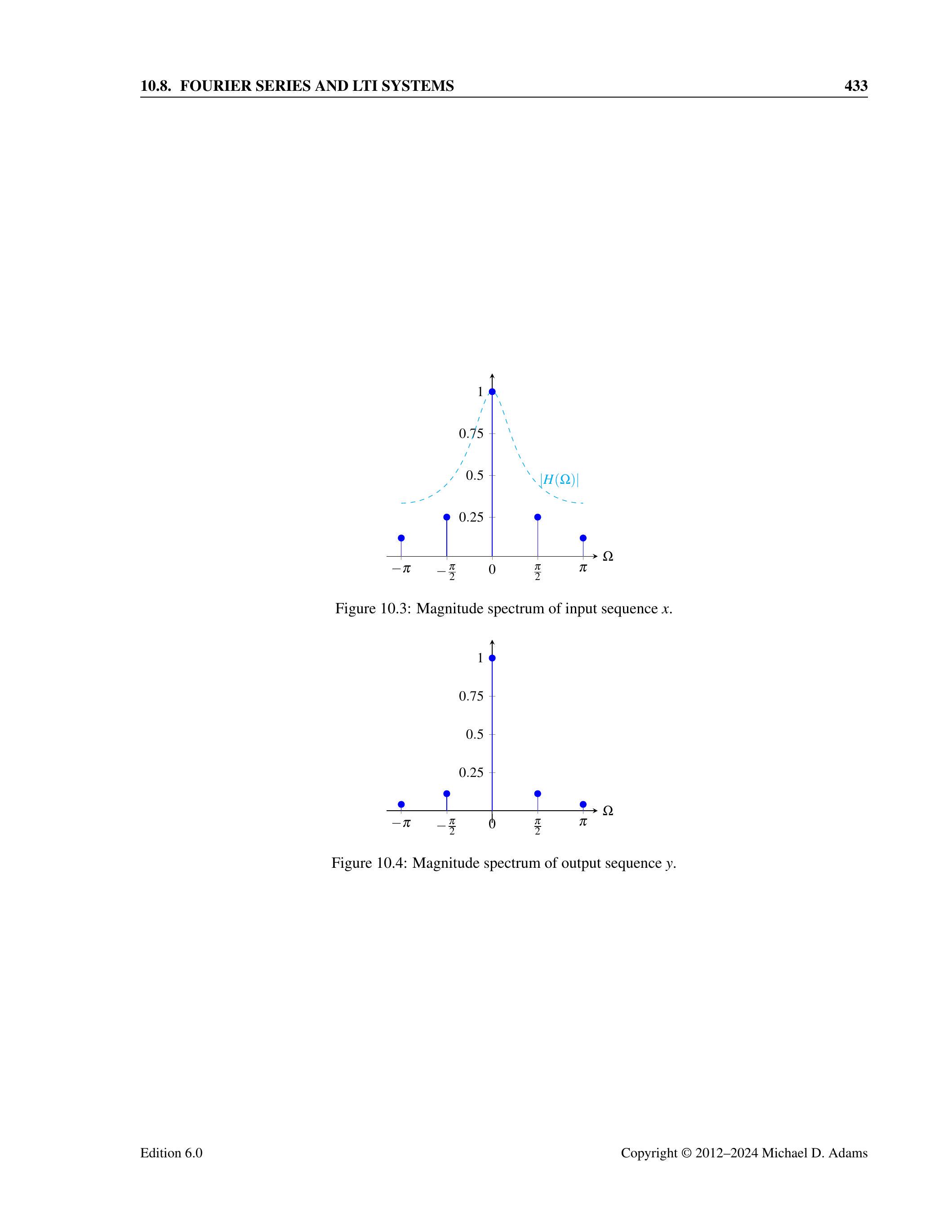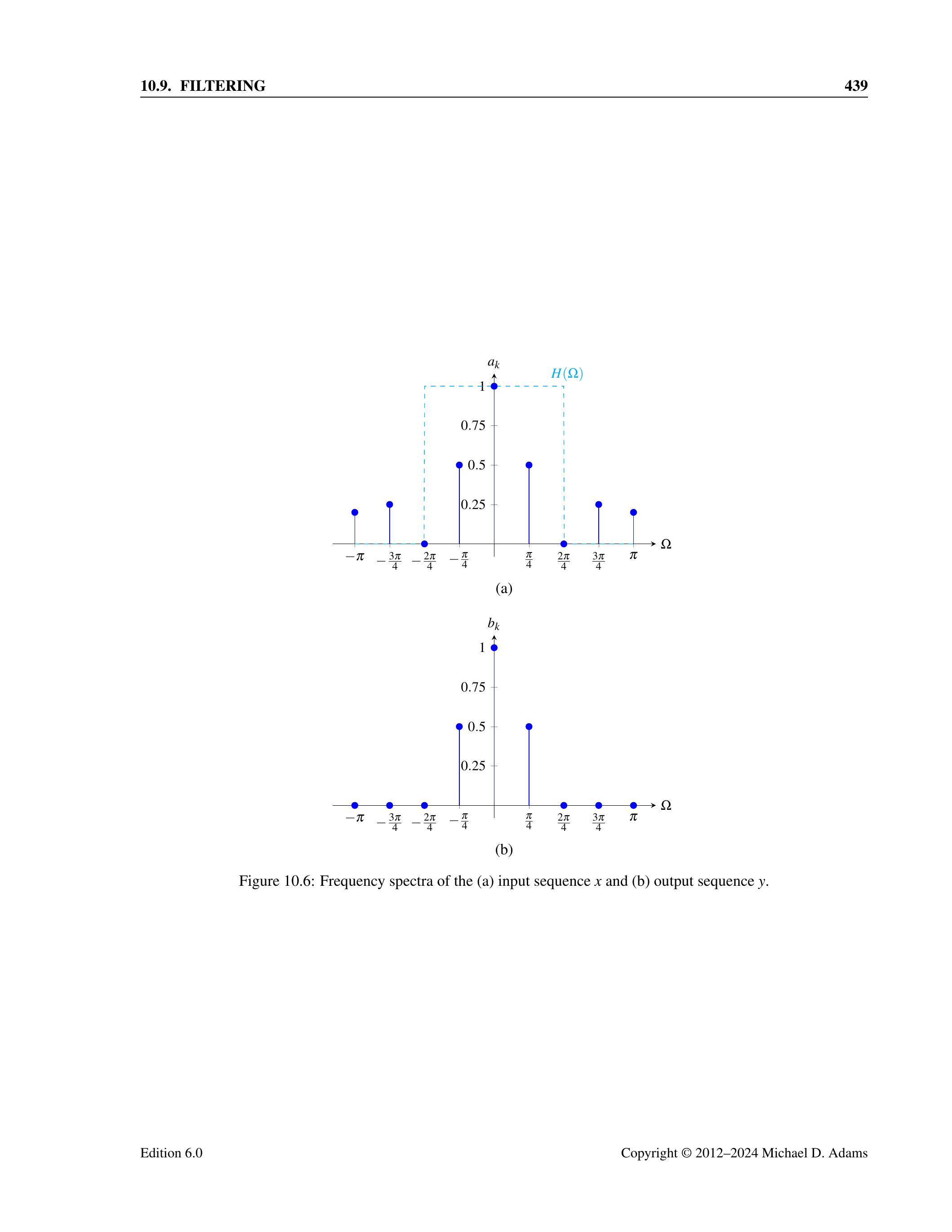 图 10.6:(a)输入序列 \(x\) 的频谱,(b)输出序列 \(y\) 的频谱。