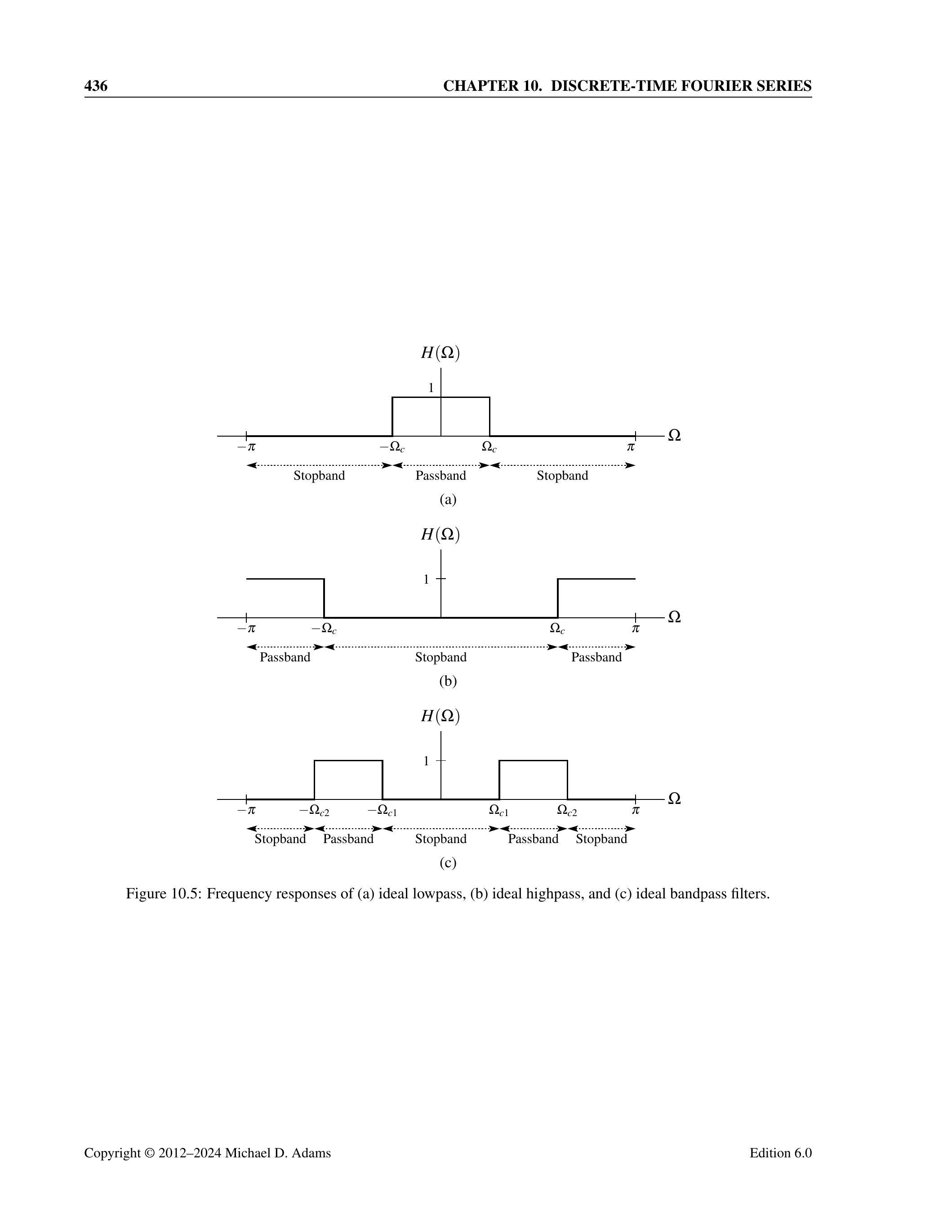 其中通带范围为 \(\Omega_{c 1}\) 和 \(\Omega_{c 2}\)。该频率响应的图示如图 10.5(c) 所示。