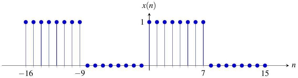 本质上,\(x_{M}\) 在以原点为中心的约 \(2M\) 个元素上与 \(x\) 完全相同。现在,我们将 \(x_{M}(n)\) 在 \(n \in[-M . . M-1]\) 的部分重复,形成一个 \(2M\)-周期序列 \(\tilde{x}\)。即,我们定义 \(\tilde{x}\) 为: