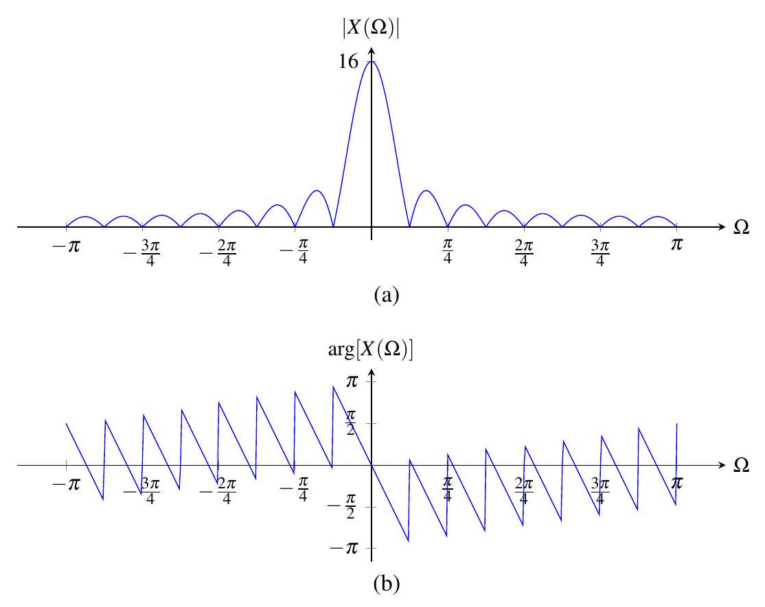 (b) \(X(\Omega)=e^{j(13 / 2) \Omega} \frac{\sin (2 \Omega)}{\sin (\Omega / 2)}\)