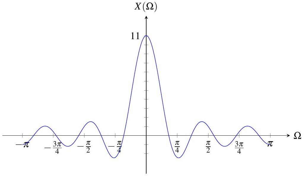 (e) \(X(\Omega)=\frac{\sin(4\Omega)}{\sin(\frac{1}{2}\Omega)}\):有效,周期 \(2\pi\),常见于有限长矩形序列;
