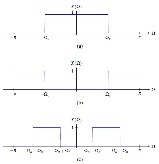 (a) \(X(\Omega)=\begin{cases}1,& |\Omega|\le B \\ 0,& B<|\Omega|\le \pi\end{cases}\),其中 \(B\) 为正实常数;