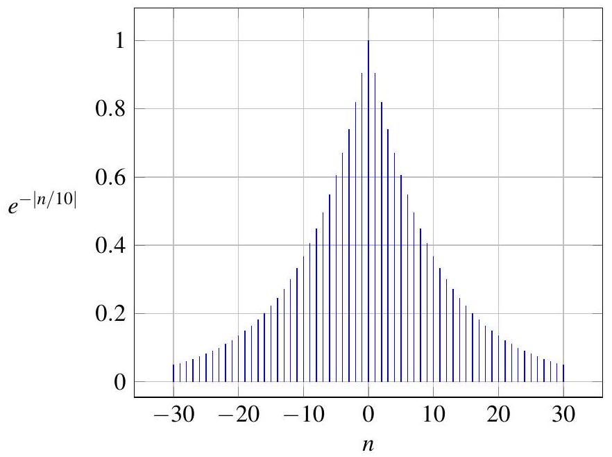 图 12.1:\(e^{-|n/10|}\) 随 \(n\) 的变化图。