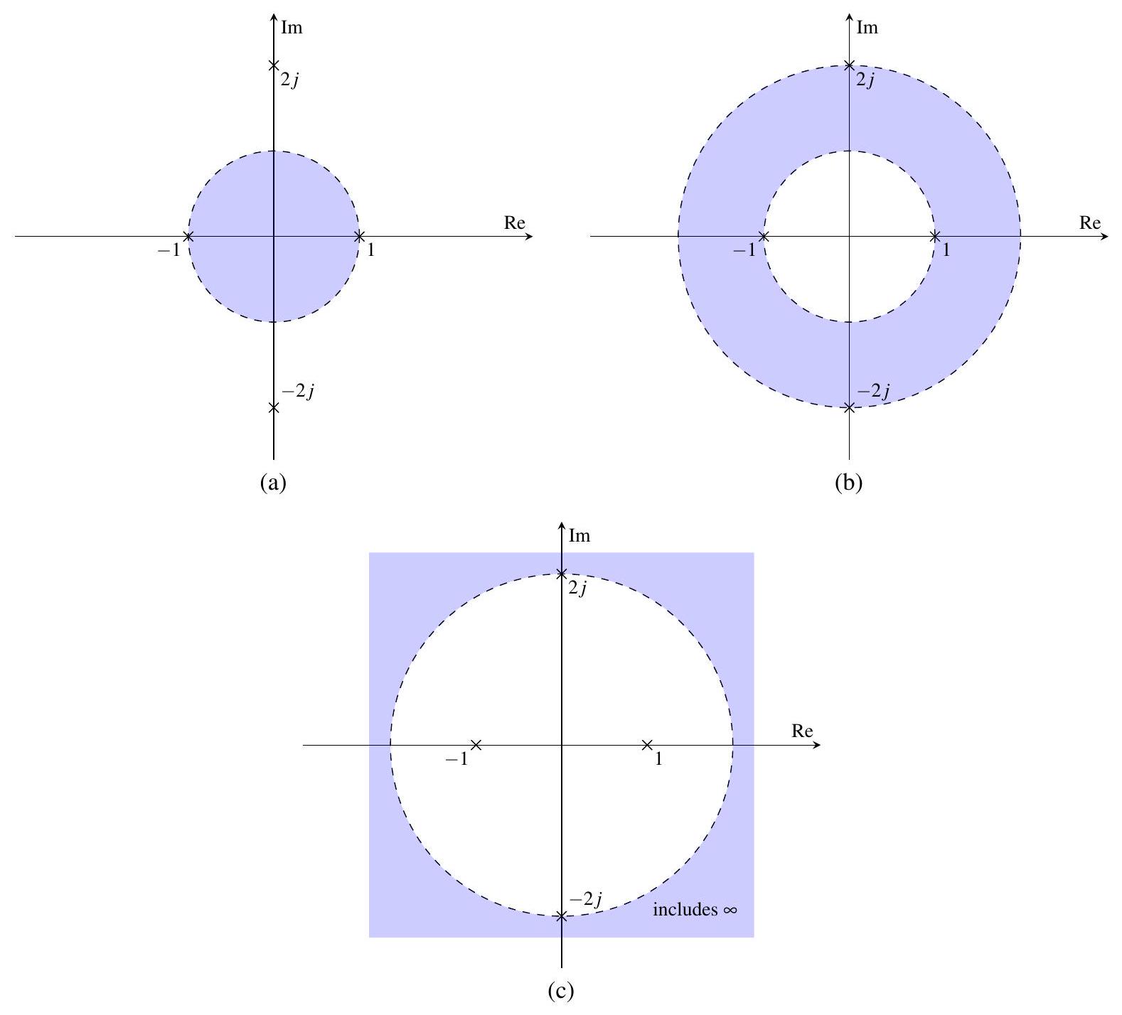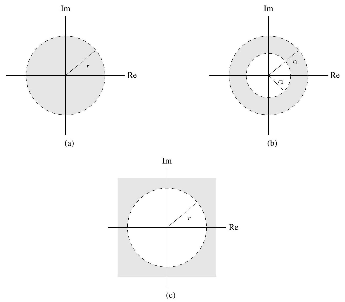 在详细讨论 \(z\) 变换的收敛域(ROC)之前,我们需要先引入一些涉及复平面集合的术语。