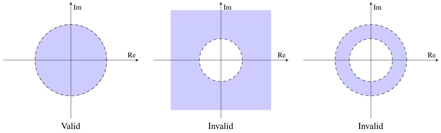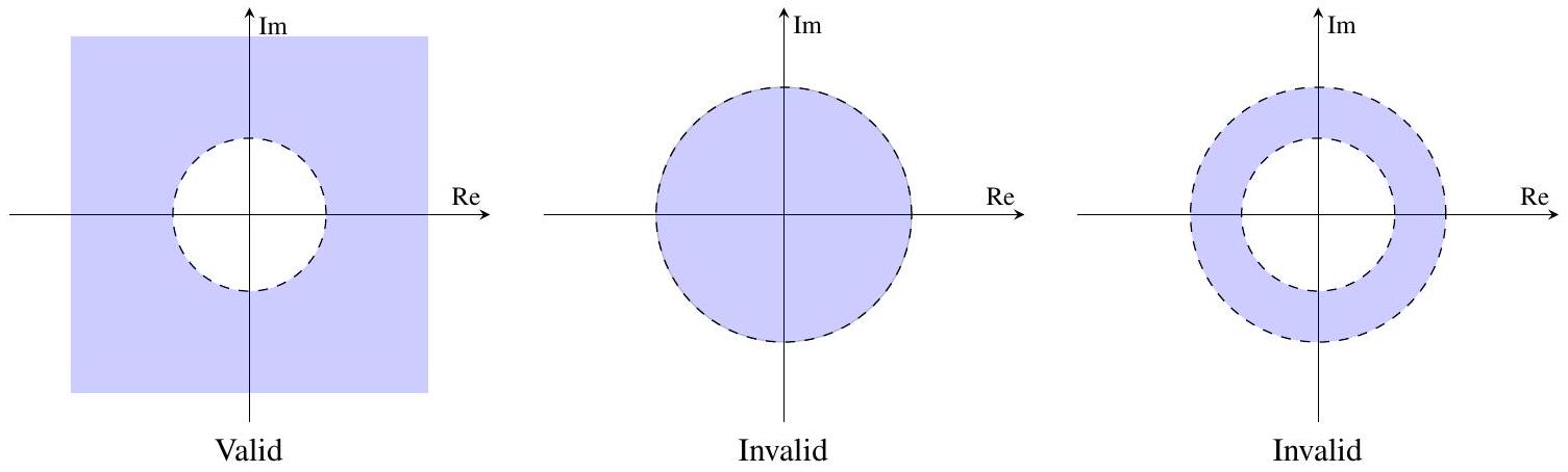 图 12.7 展示了一些可能作为有理 \(z\) 变换ROC的有效或无效集合示例。
