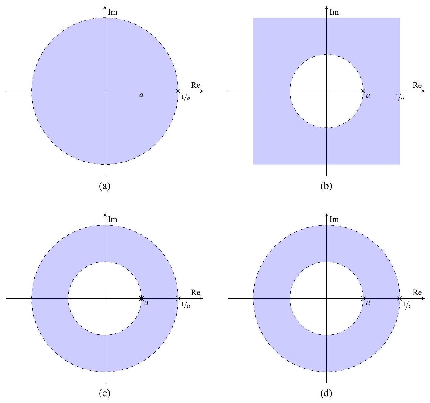 此时,我们比较例 12.3 和例 12.4 的结果,并做出一个重要观察。注意在这两个例子中得到的 \(X\) 的代数表达式相同(即 \(X(z)=\frac{z}{z-a}\))。唯一的区别在于 \(X\) 的收敛区域。在一个例子中,\(X(z)\) 在 \(|z|>|a|\) 时收敛,而在另一个例子中,它在 \(|z|<|a|\) 时收敛。事实证明,要唯一确定 \(x=z^{-1} X\),必须同时给出 \(X\) 的代数表达式及其收敛区域。