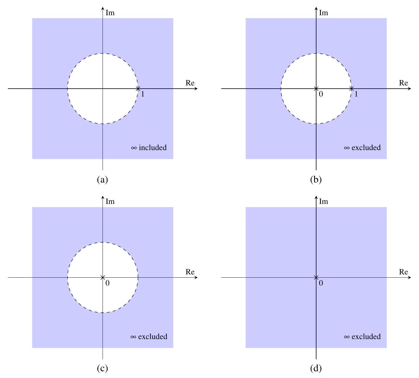 - \(z\)变换 \(X\) 的ROC由以原点为中心的同心圆组成。也就是说,如果一个点 \(z_{0}\) 在ROC内,那么经过 \(z_{0}\) 的以原点为中心的圆(即 \(|z|=\left|z_{0}\right|\))也在ROC内。