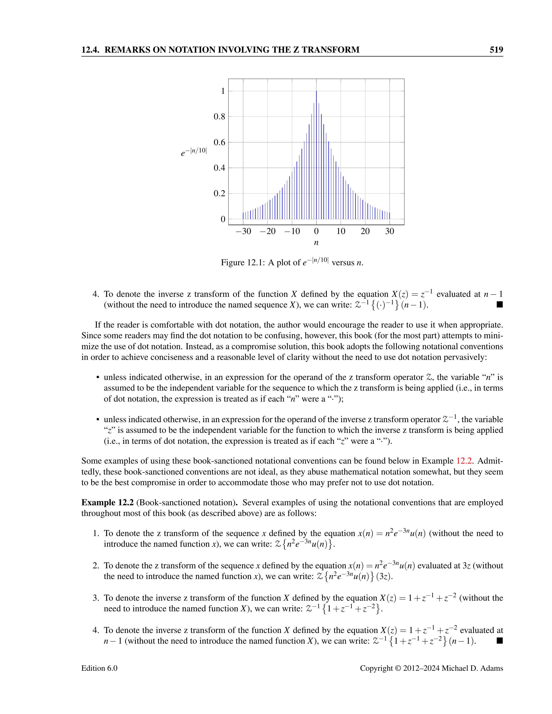 由于对序列施加 z 变换算子会得到一个函数,我们可以在某些点上对该函数取值。同理,由于对函数施加逆 z 变换算子会得到一个序列,我们也可以在某些点上对该序列取值。再次考虑图 12.1 中的序列,它将 \(n\) 映射为 \(e^{-|n/10|}\)。若要表示该序列 z 变换在 \(3z\) 处的取值,用点符号可写作“\(z\{e^{-|\cdot/10|}\}(3z)\)”,或根据本书推荐的符号约定写作“\(z\{e^{-|n/10|}\}(3z)\)”。