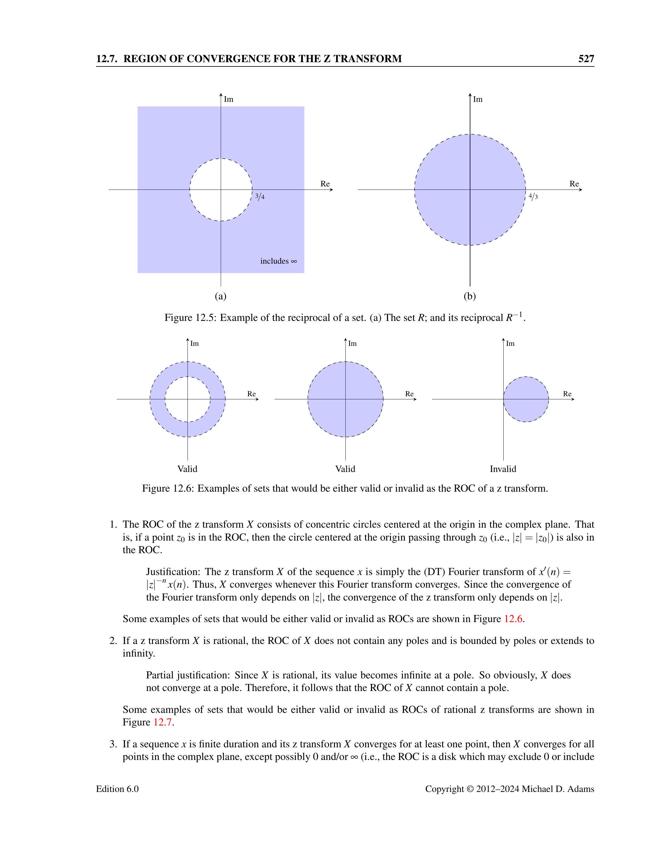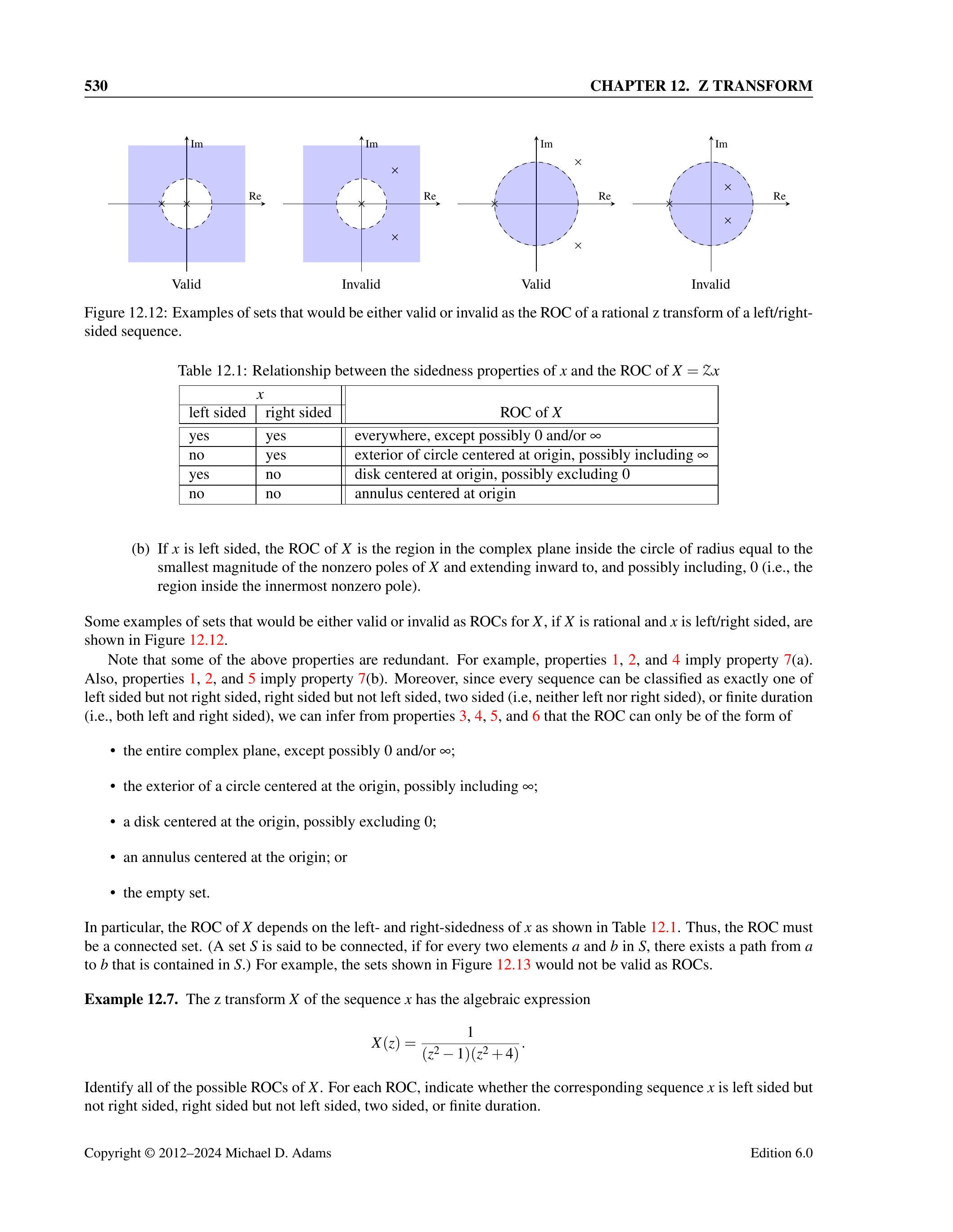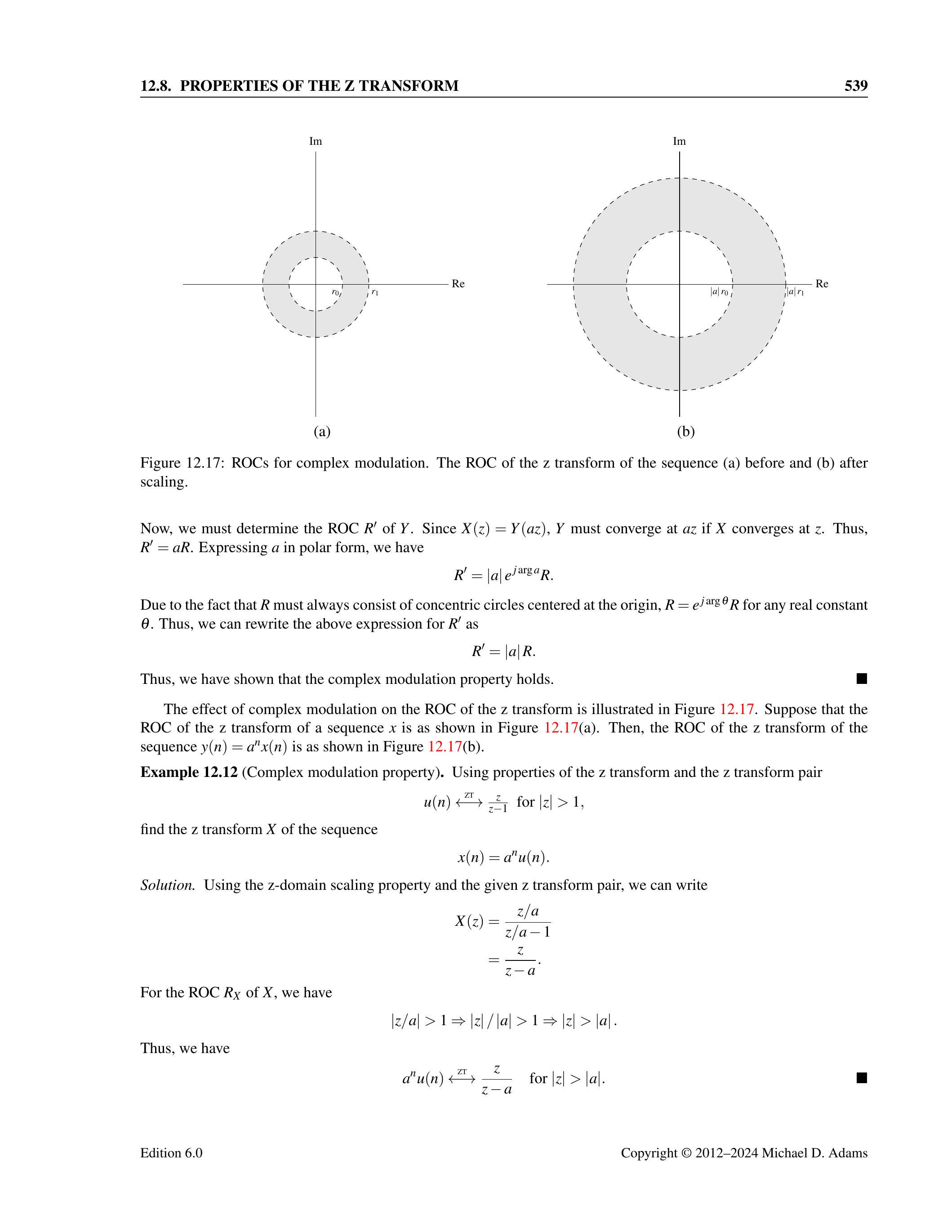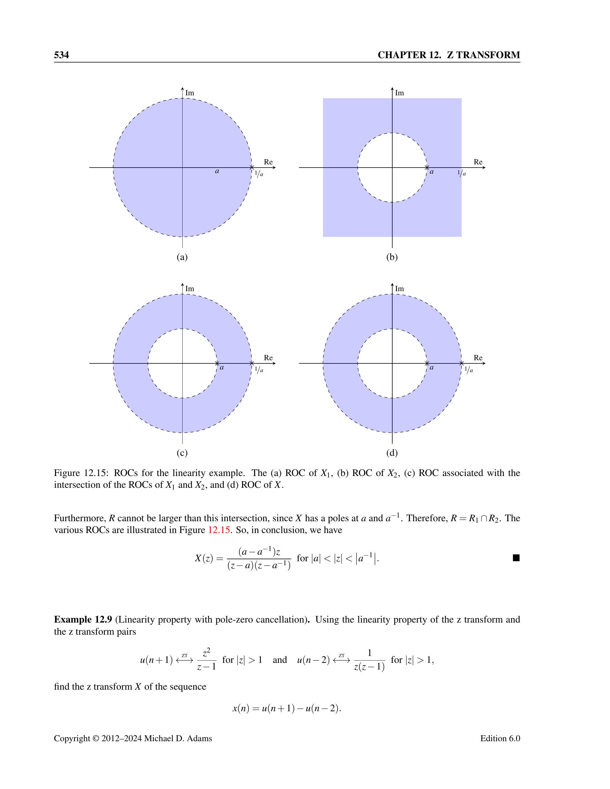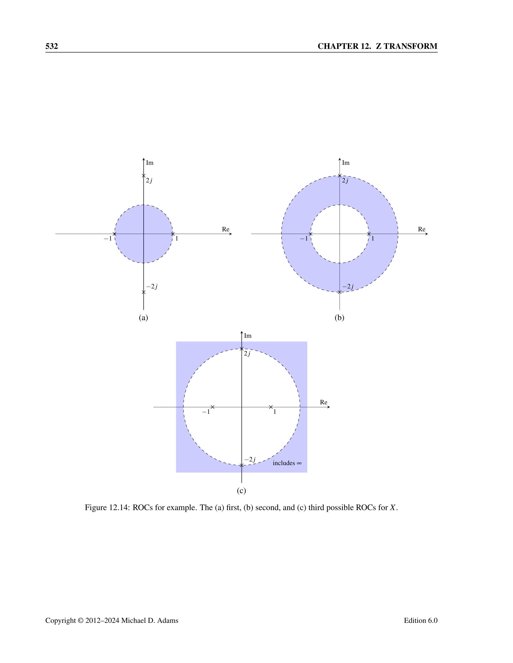 此时,我们比较例 12.3 和例 12.4 的结果,并做出一个重要观察。注意在这两个例子中得到的 \(X\) 的代数表达式相同(即 \(X(z)=\frac{z}{z-a}\))。唯一的区别在于 \(X\) 的收敛区域。在一个例子中,\(X(z)\) 在 \(|z|>|a|\) 时收敛,而在另一个例子中,它在 \(|z|<|a|\) 时收敛。事实证明,要唯一确定 \(x=z^{-1} X\),必须同时给出 \(X\) 的代数表达式及其收敛区域。