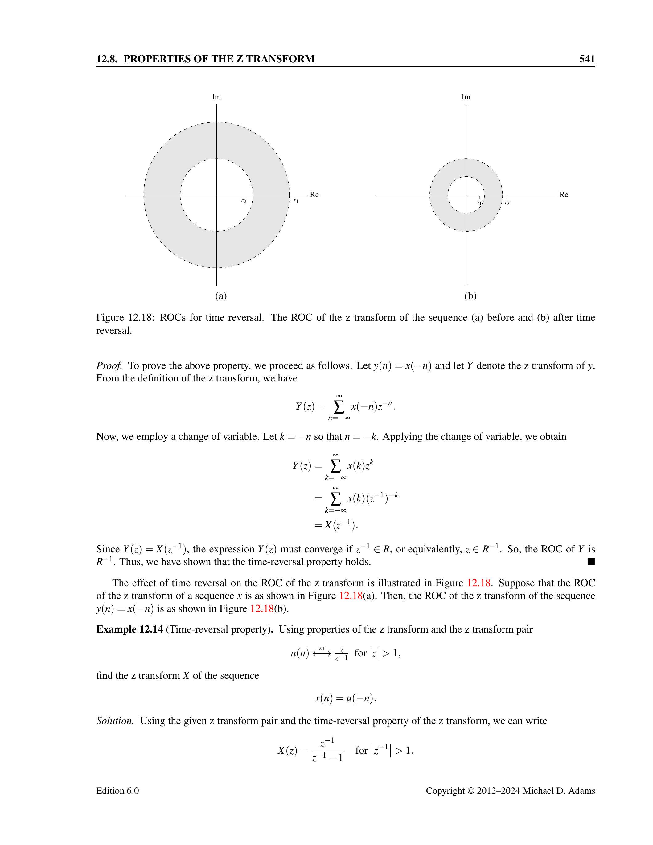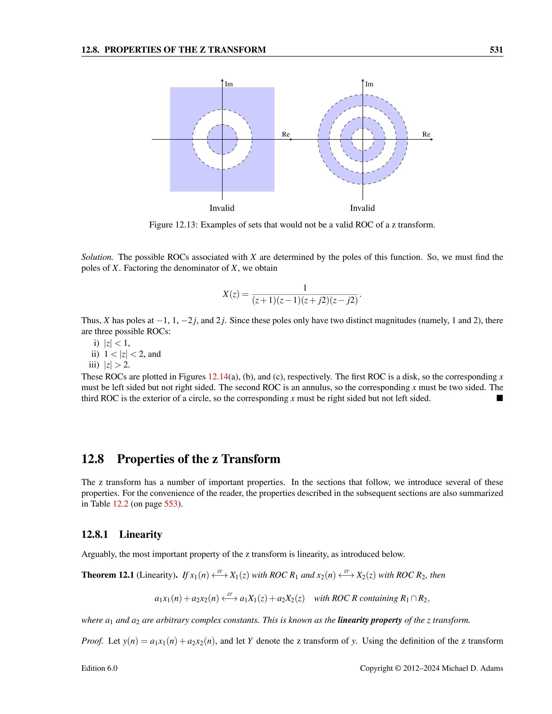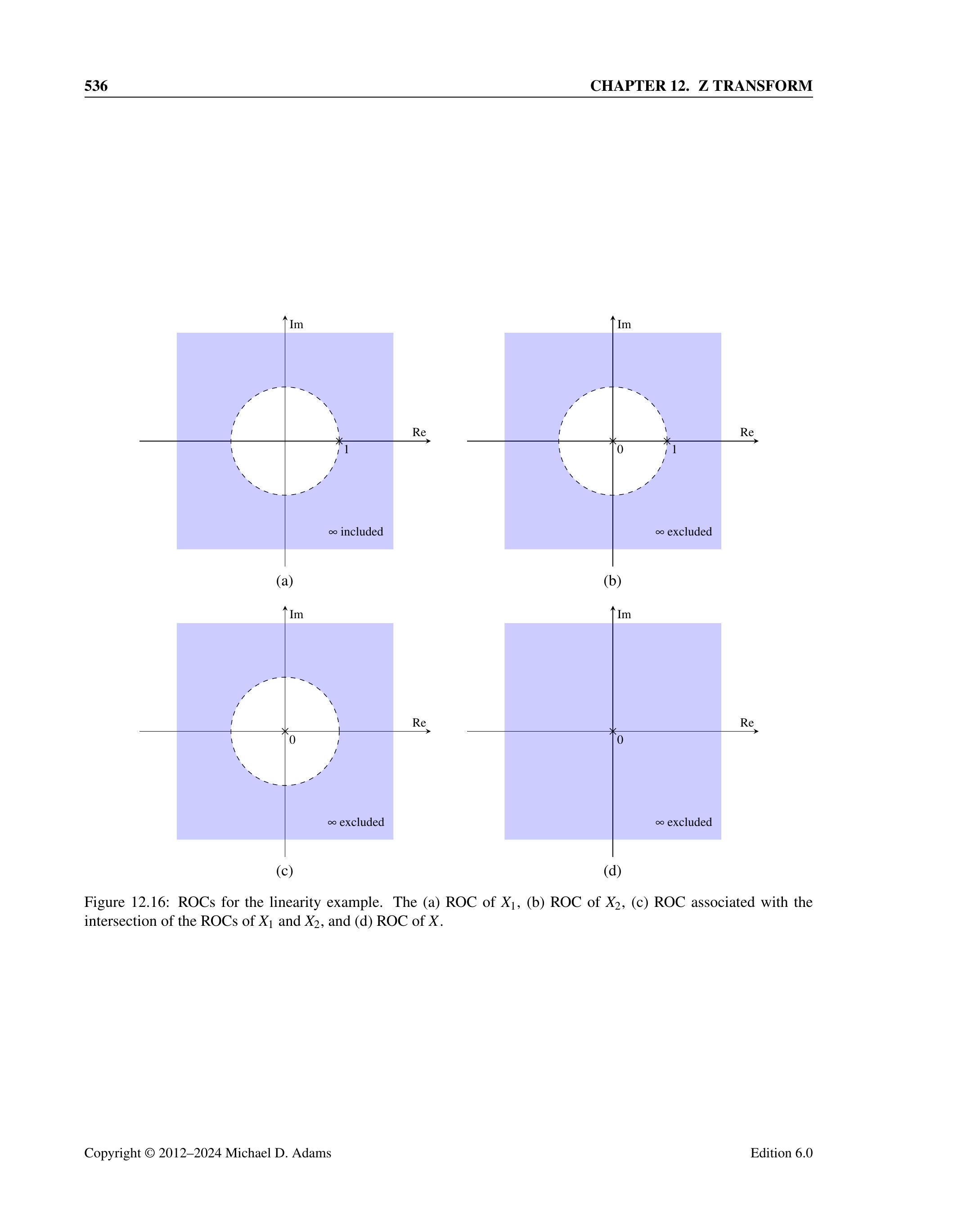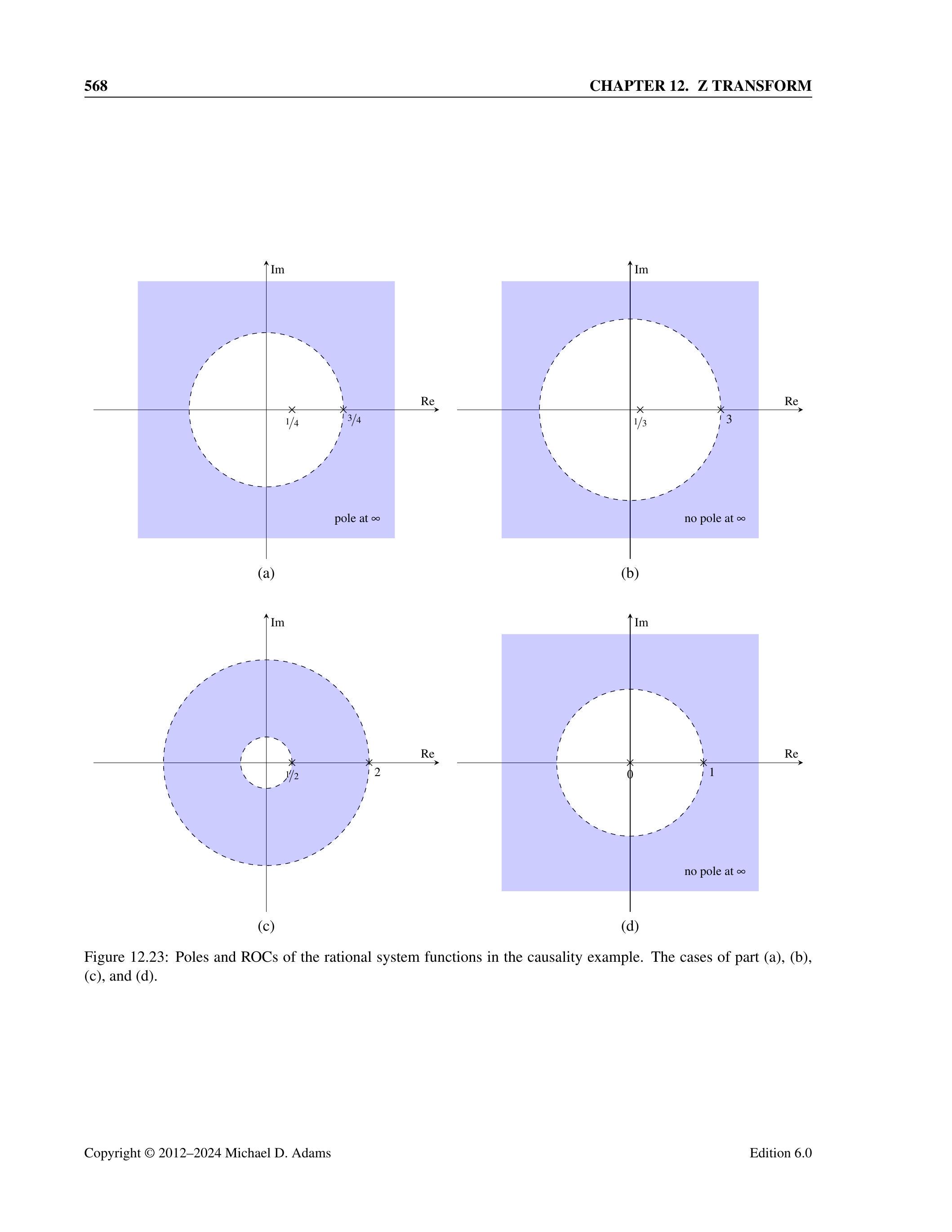 此时,我们比较例 12.3 和例 12.4 的结果,并做出一个重要观察。注意在这两个例子中得到的 \(X\) 的代数表达式相同(即 \(X(z)=\frac{z}{z-a}\))。唯一的区别在于 \(X\) 的收敛区域。在一个例子中,\(X(z)\) 在 \(|z|>|a|\) 时收敛,而在另一个例子中,它在 \(|z|<|a|\) 时收敛。事实证明,要唯一确定 \(x=z^{-1} X\),必须同时给出 \(X\) 的代数表达式及其收敛区域。