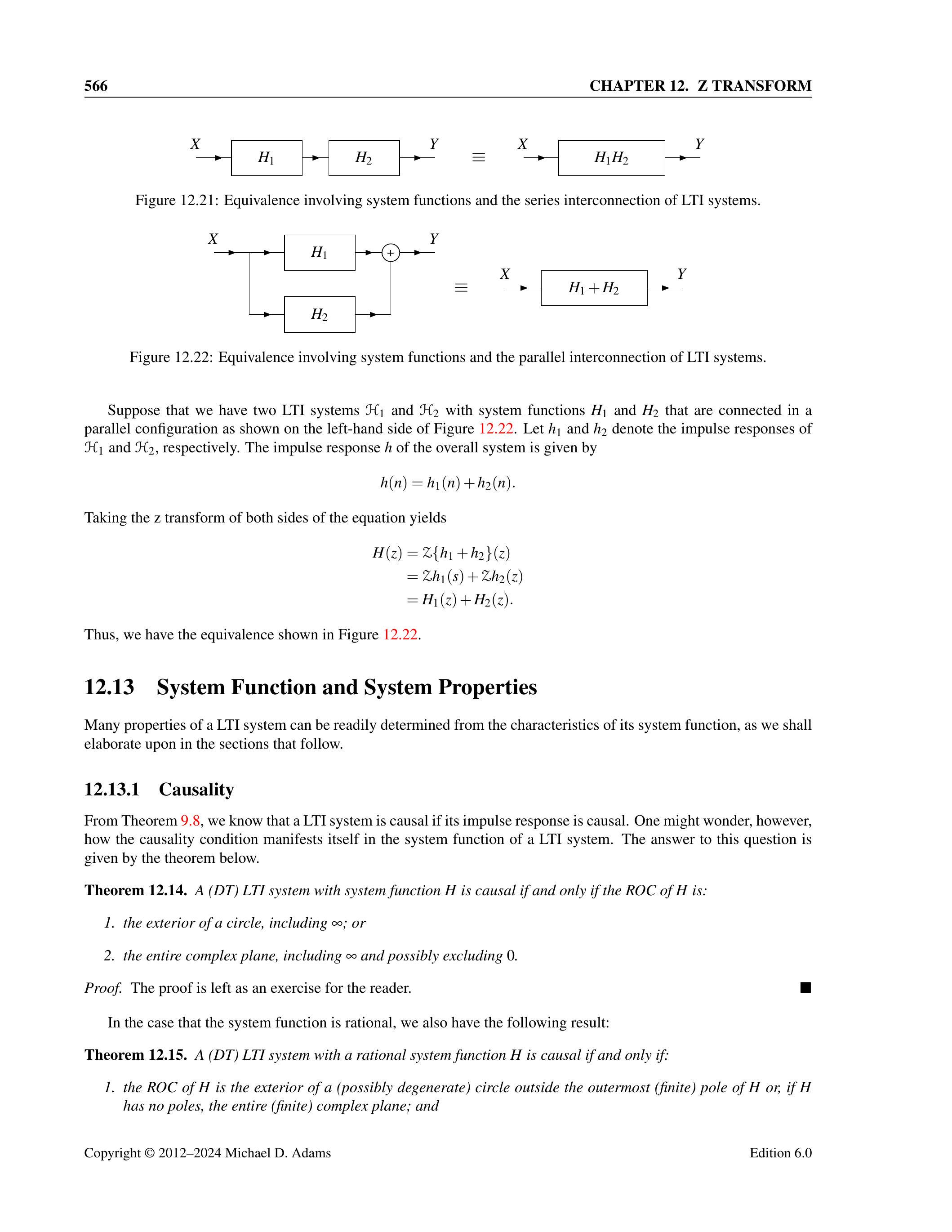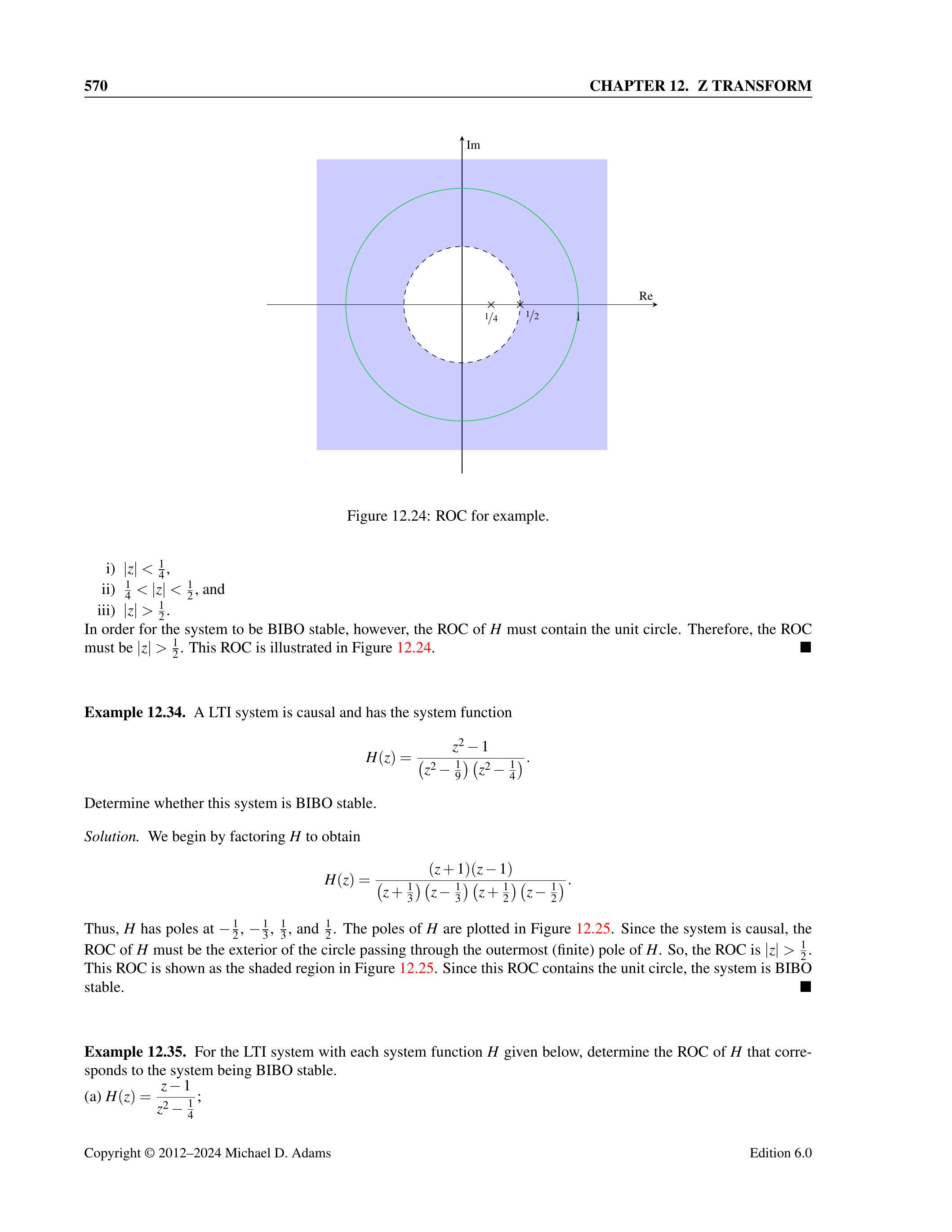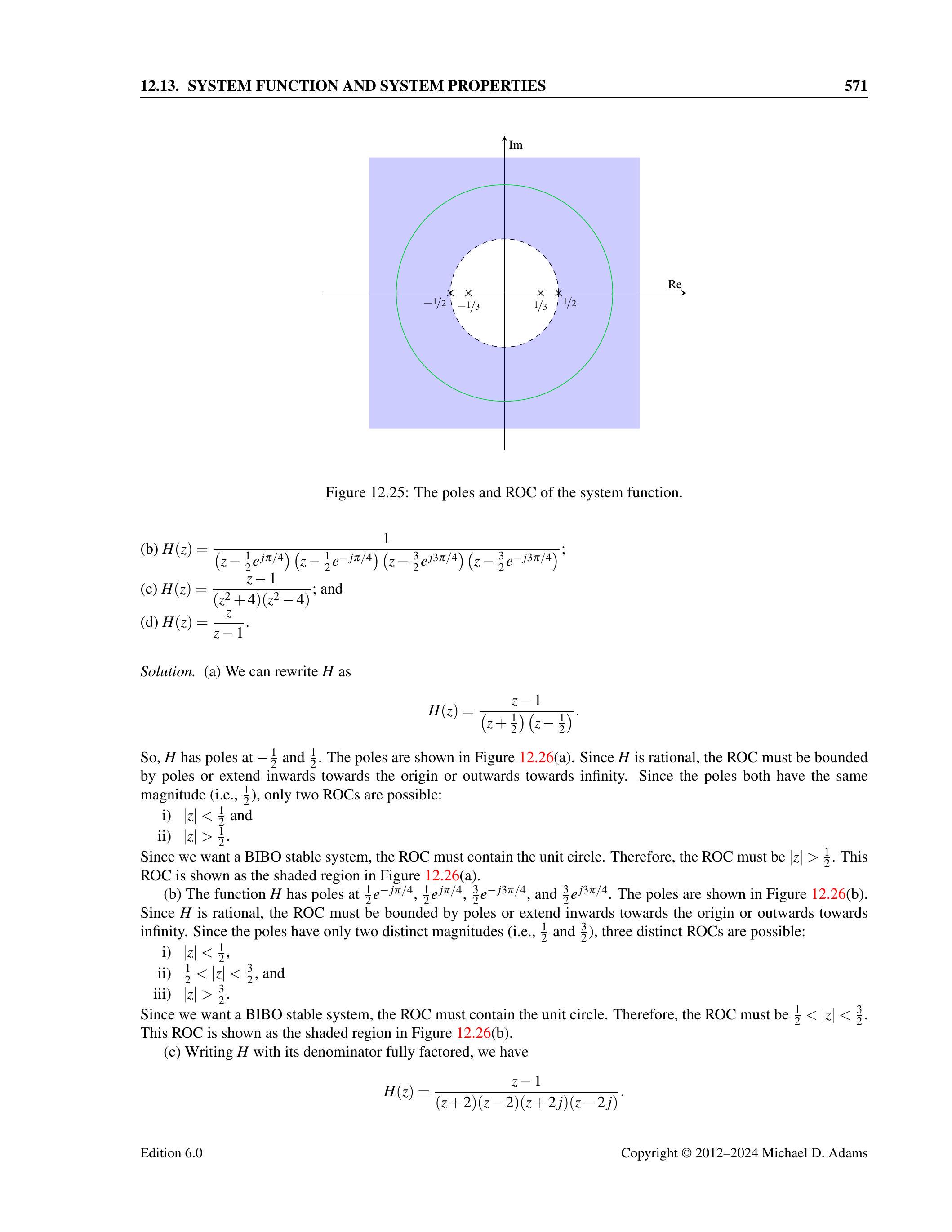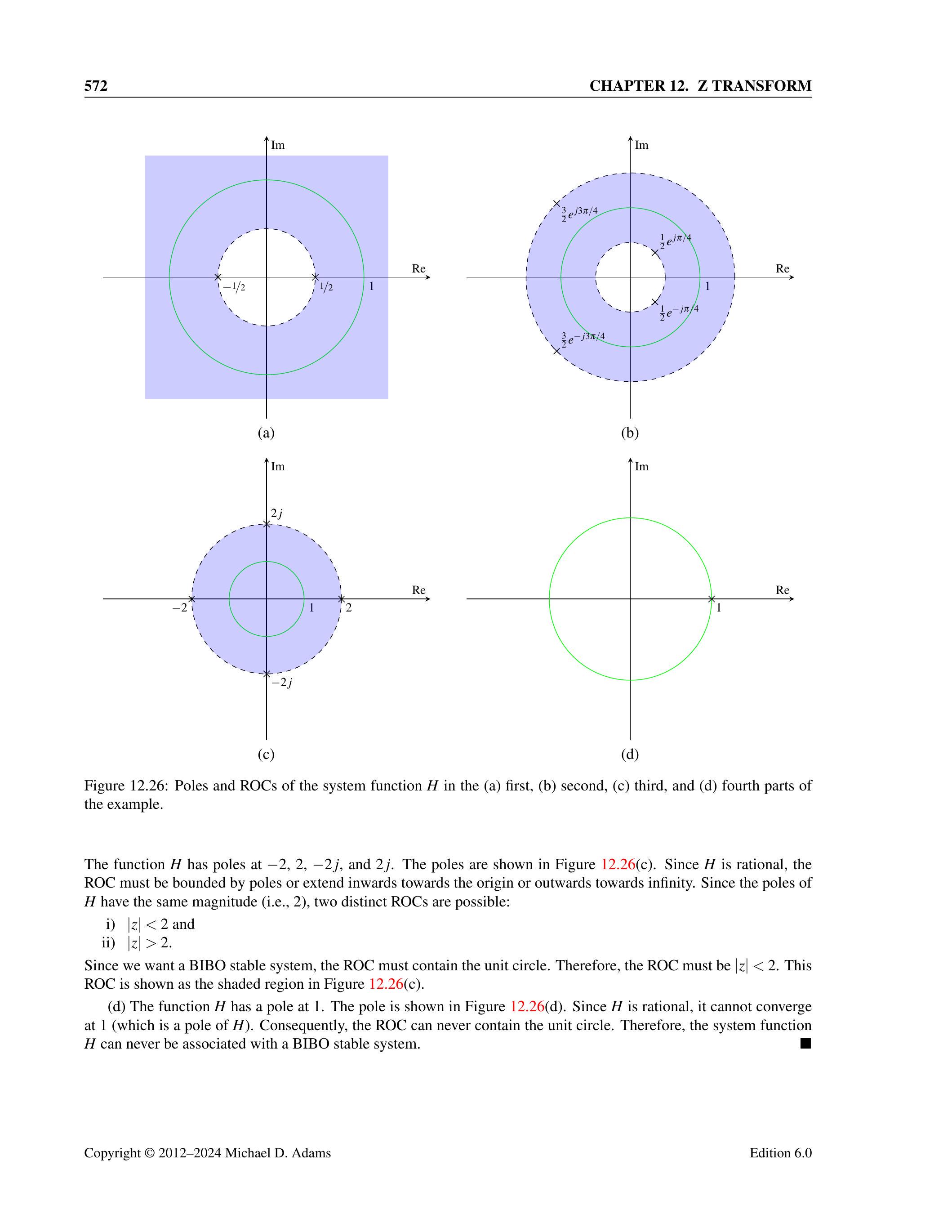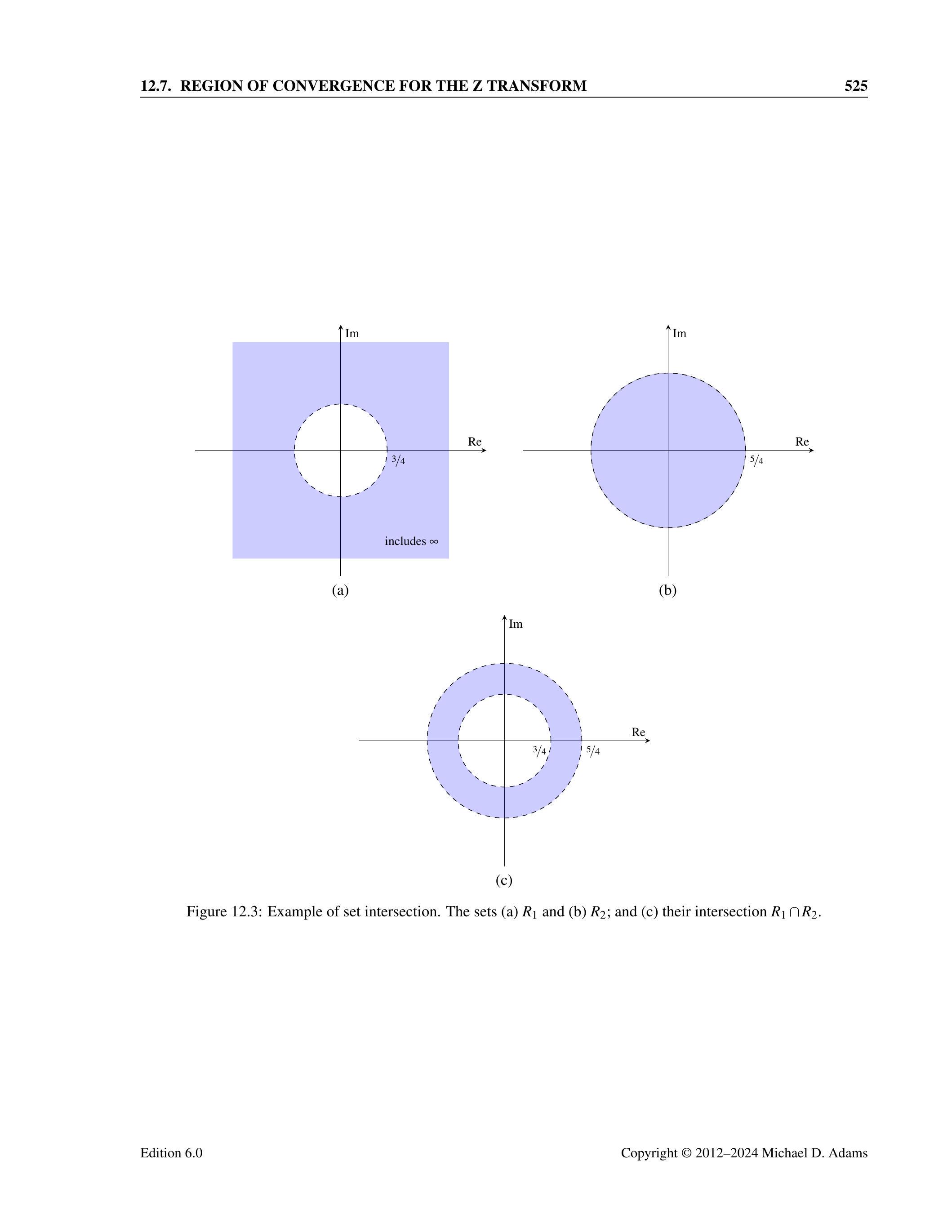 此时,我们比较例 12.3 和例 12.4 的结果,并做出一个重要观察。注意在这两个例子中得到的 \(X\) 的代数表达式相同(即 \(X(z)=\frac{z}{z-a}\))。唯一的区别在于 \(X\) 的收敛区域。在一个例子中,\(X(z)\) 在 \(|z|>|a|\) 时收敛,而在另一个例子中,它在 \(|z|<|a|\) 时收敛。事实证明,要唯一确定 \(x=z^{-1} X\),必须同时给出 \(X\) 的代数表达式及其收敛区域。