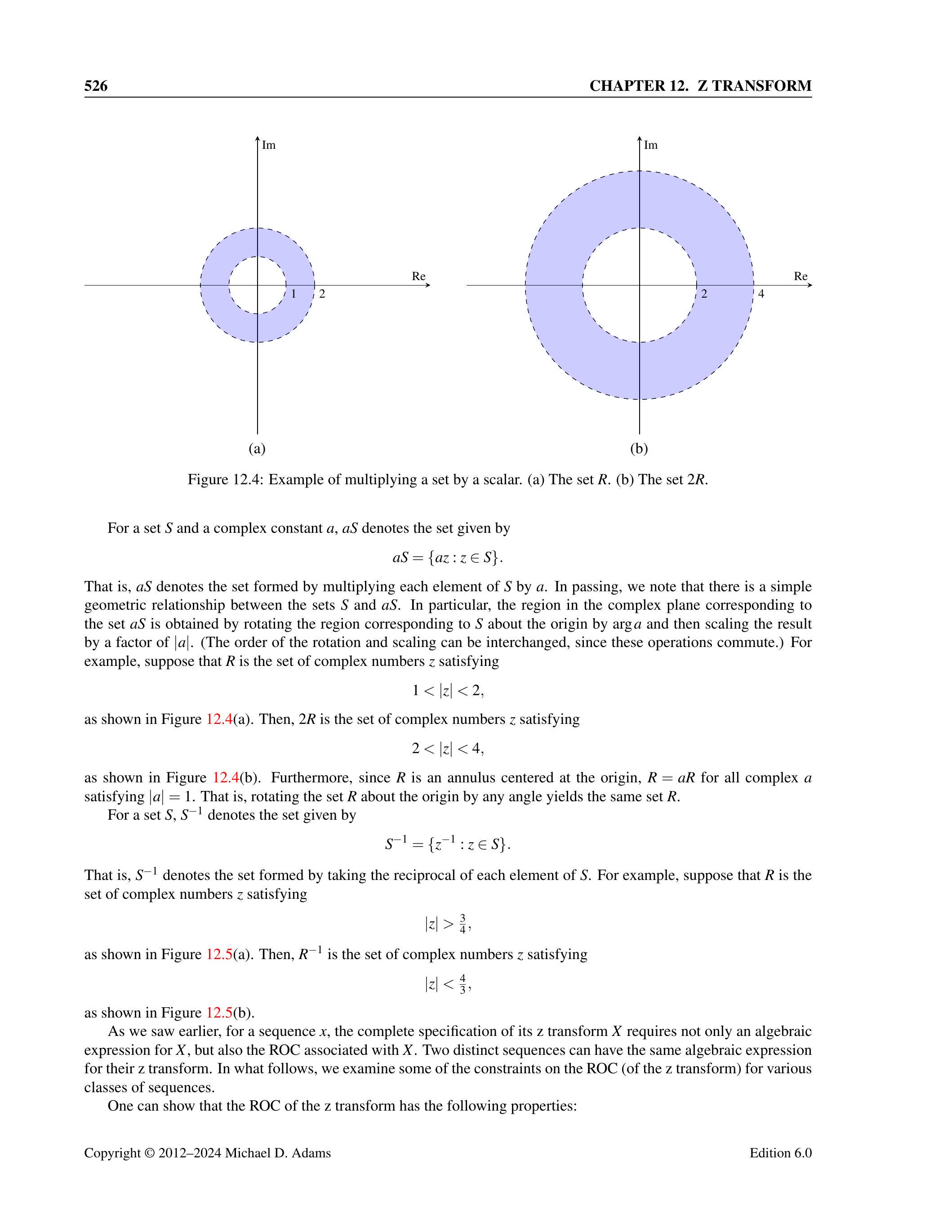 的复数 \(z\) 的集合,如图 12.4(b) 所示。进一步,由于 \(R\) 是以原点为中心的环形区域,所以对于所有满足 \(|a|=1\) 的复数 \(a\),都有 \(R=aR\)。也就是说,将集合 \(R\) 绕原点旋转任意角度,得到的仍然是同一个集合 \(R\)。
