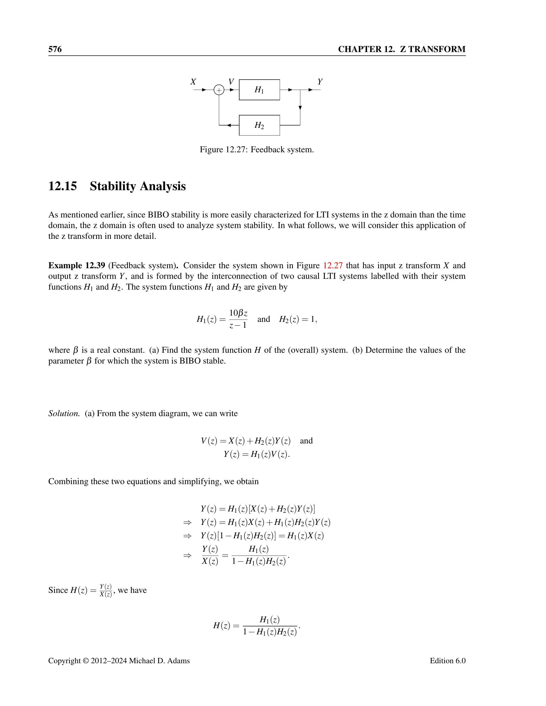 例 12.45(二阶差分方程)。考虑一个因果系统,其输入为 \(x\),输出为 \(y\),由以下差分方程描述: