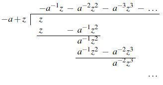 为了化简上述求和式,我们回顾无穷几何级数的求和公式(由 (F.9) 给出)。该求和在 \(\left|a z^{-1}\right|<1\) 时收敛。对该不等式整理,我们得到