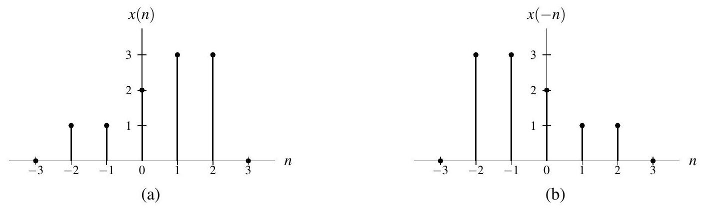 换句话说,序列 \(y\) 是通过在 \(x(n)\) 的表达式中将 \(n\) 替换为 \(-n\) 而得到的。从几何上看,变换 (8.2) 将序列 \(x\) 关于原点进行镜像,从而得到 \(y\)。