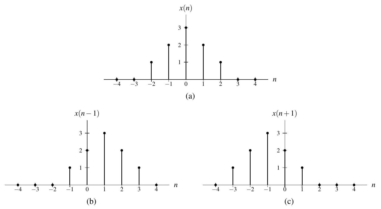 其中 \(b\) 是一个整数常数。换句话说,序列 \(y\) 是通过在 \(x(n)\) 的表达式中将 \(n\) 替换为 \(n-b\) 而得到的。从几何上看,变换 (8.1) 将序列 \(x\) 沿时间轴平移,得到 \(y\)。若 \(b>0\),则 \(y\) 相对于 \(x\) 向右平移(即延迟);若 \(b<0\),则 \(y\) 相对于 \(x\) 向左平移(即超前)。