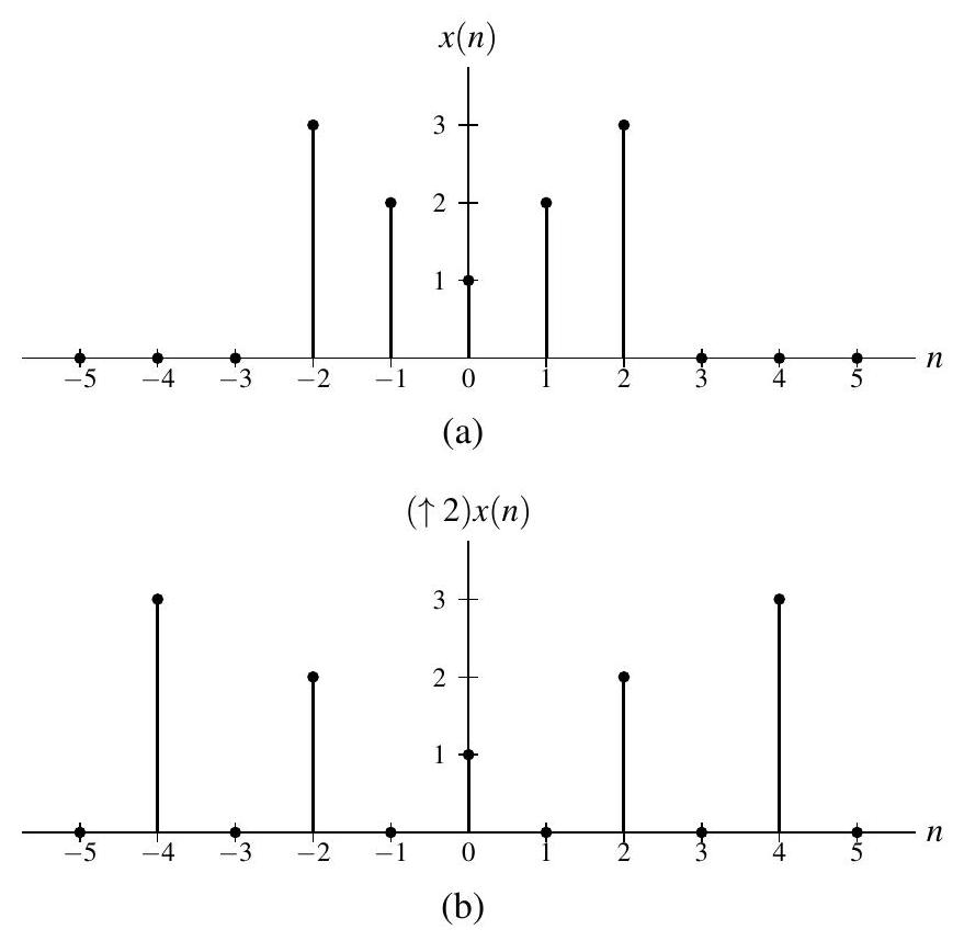 为了说明插值的效果,图 8.4 给出了一个例子。对图 8.4(a) 中的序列 \(x\) 进行 2 倍插值,可以得到图 8.4(b) 中的序列。