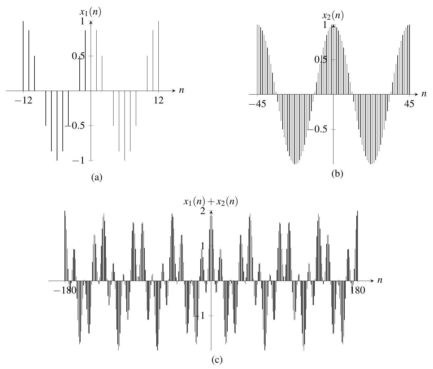 设 \(x_{1}\) 和 \(x_{2}\) 分别为周期为 \(N_{1}\) 与 \(N_{2}\) 的周期序列,则 \(x=x_{1}+x_{2}\) 是一个周期为