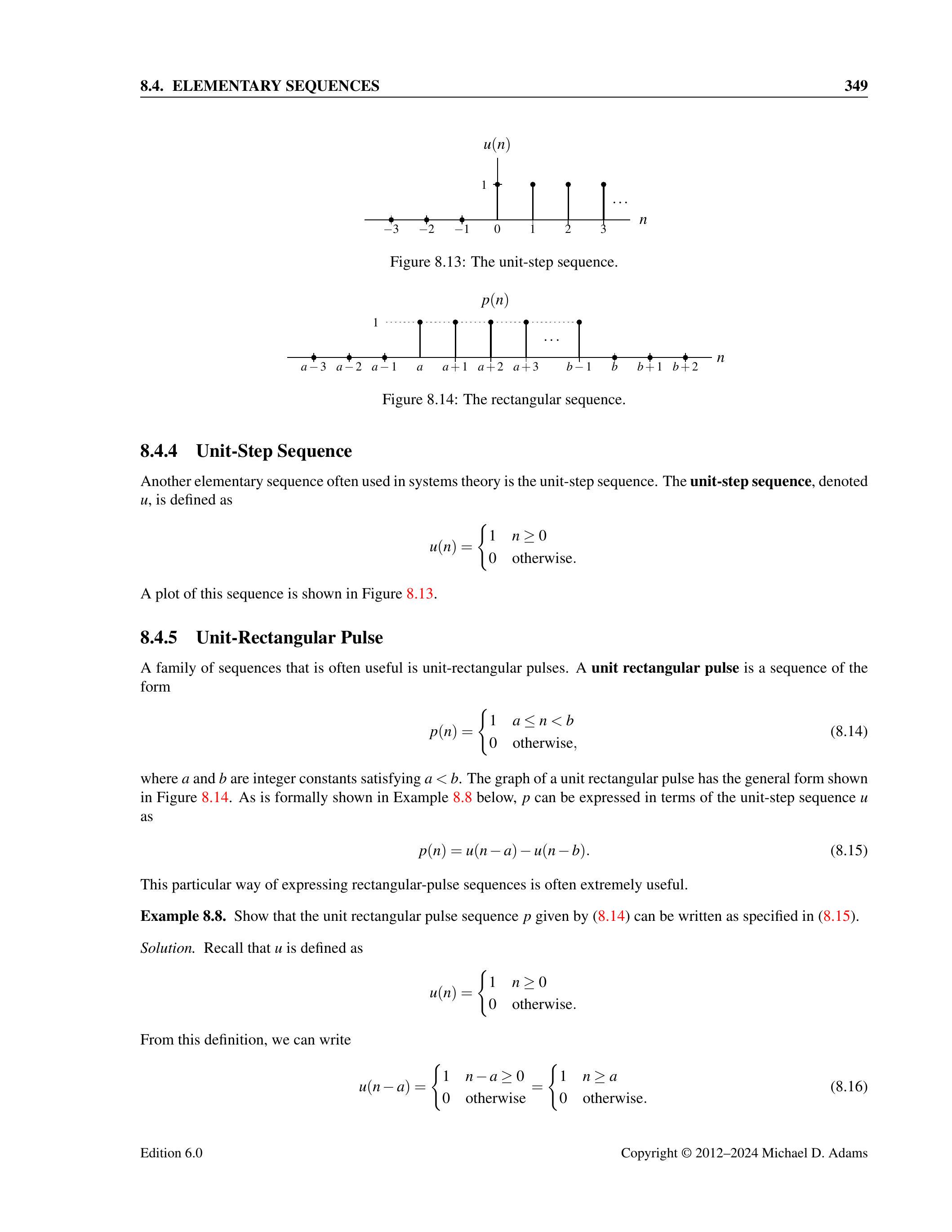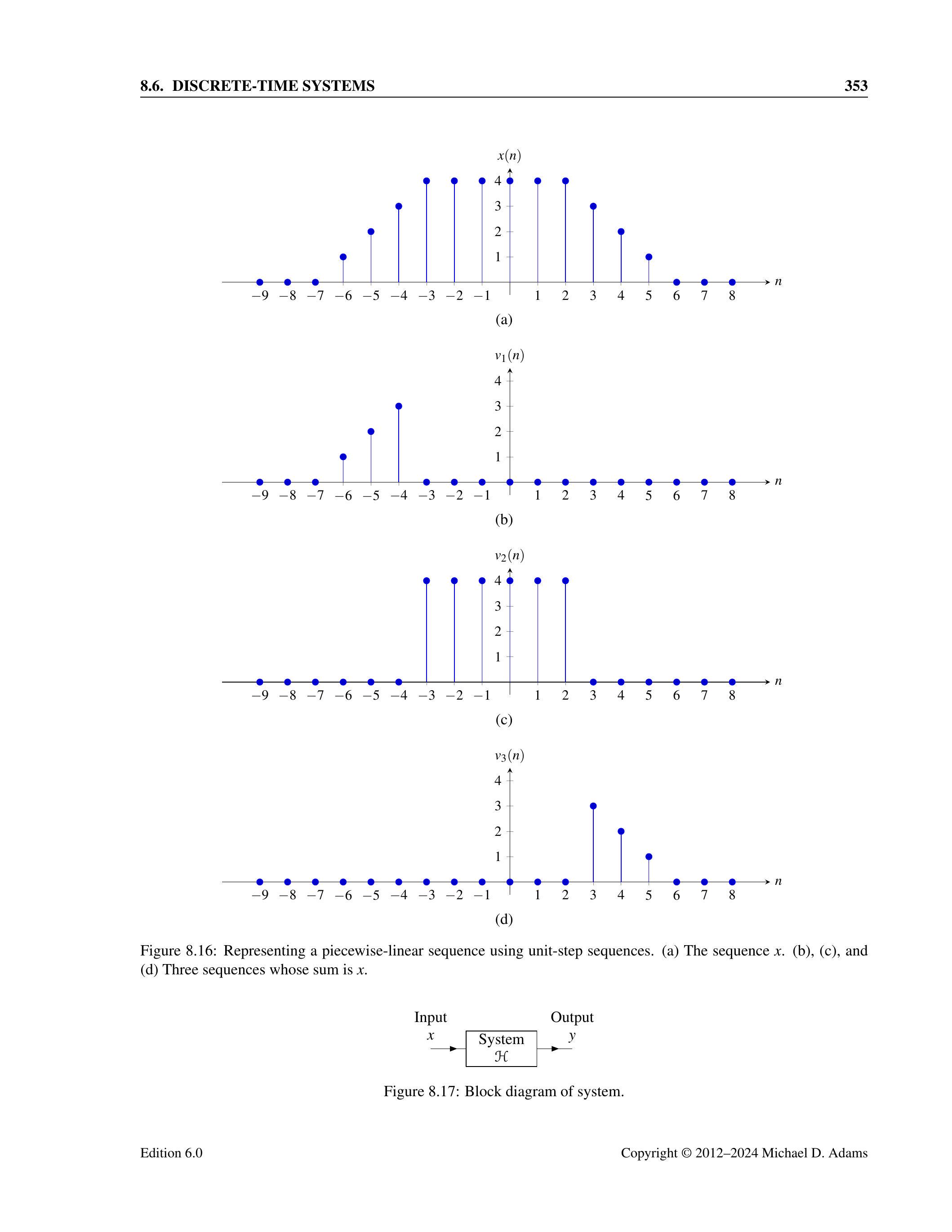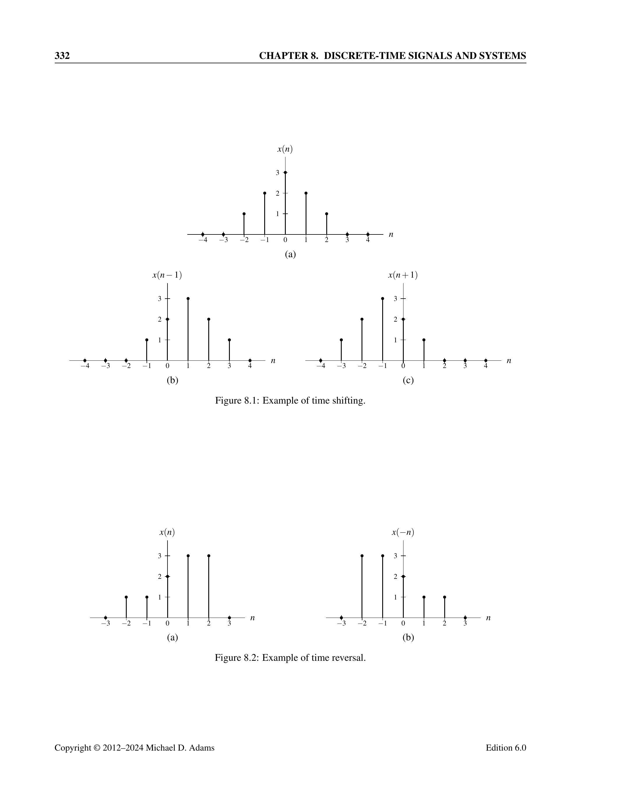 其中 \(b\) 是一个整数常数。换句话说,序列 \(y\) 是通过在 \(x(n)\) 的表达式中将 \(n\) 替换为 \(n-b\) 而得到的。从几何上看,变换 (8.1) 将序列 \(x\) 沿时间轴平移,得到 \(y\)。若 \(b>0\),则 \(y\) 相对于 \(x\) 向右平移(即延迟);若 \(b<0\),则 \(y\) 相对于 \(x\) 向左平移(即超前)。
