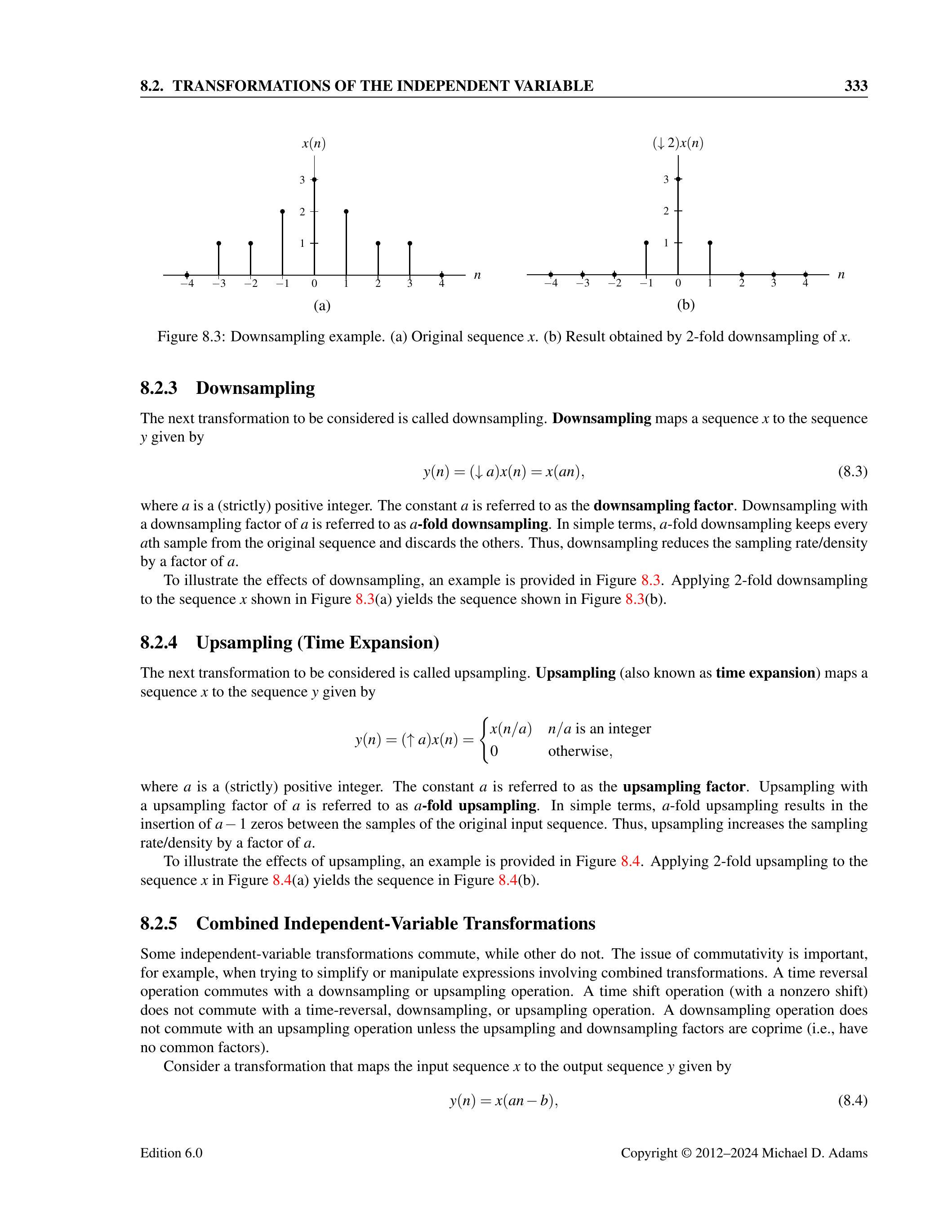 需要注意的是,这两种解释中的平移量不同(即 \(b\) 与 \(\frac{b}{a}\))。这是因为时间平移操作与抽取或时间反转操作不可交换。上述两种解释的正确性证明留作习题 8.2。