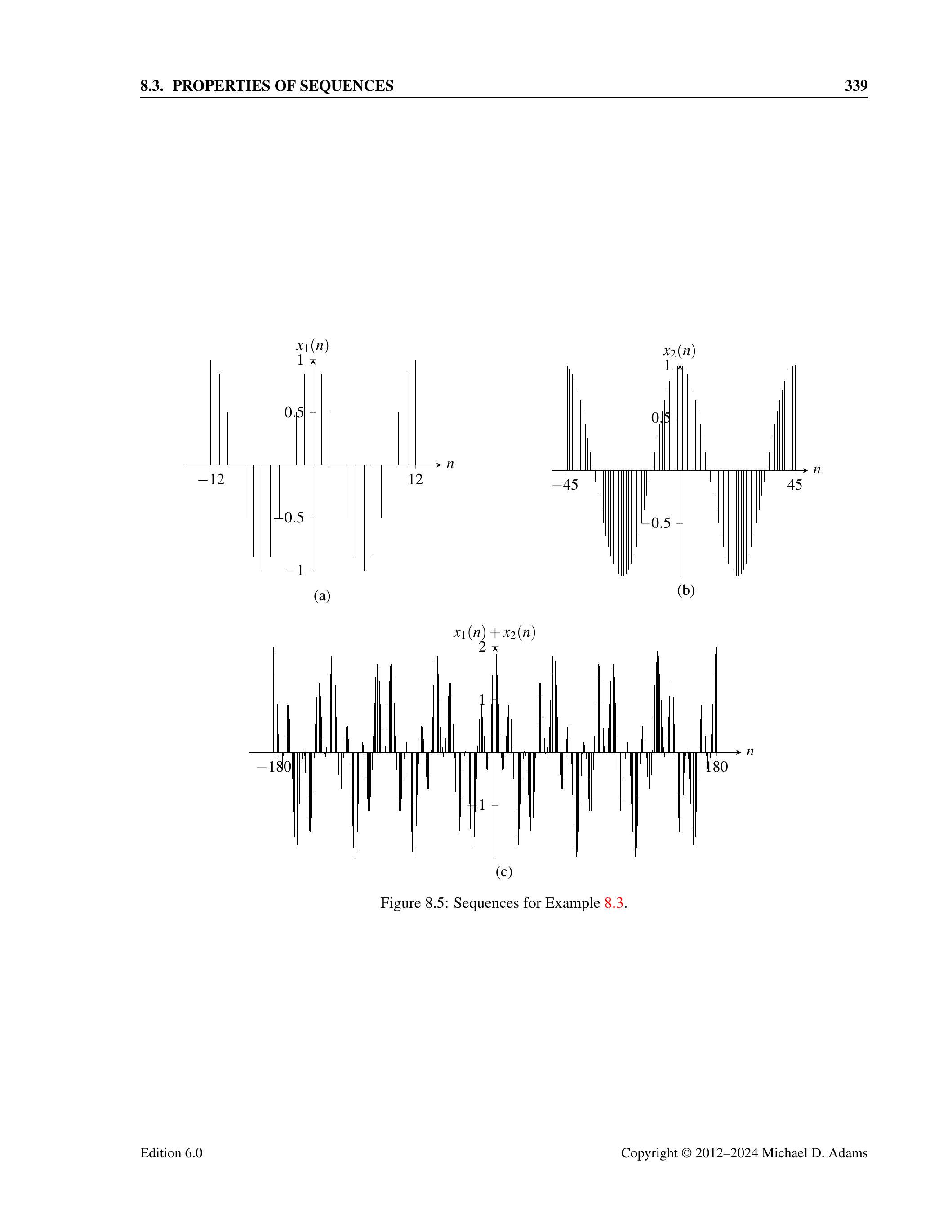 时间平移的效果如图 8.1 所示。通过对图 8.1(a) 中的序列 \(x\) 进行时间平移变换,可以得到图 8.1(b) 和 (c) 中的序列。
