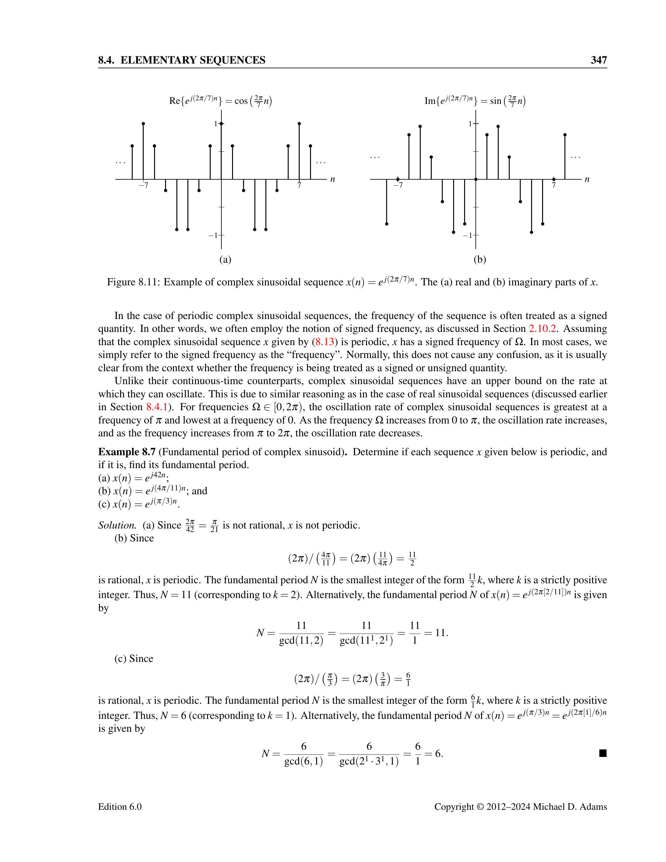 8.6 证明形如 \(x(n)=e^{j(2 \pi \ell / m) n}\) 的复正弦序列的基本周期 \(N\) 为 \(N=\frac{m}{\operatorname{gcd}(\ell, m)}\),其中 \(\operatorname{gcd}(\ell, m)\) 表示 \(\ell\) 与 \(m\) 的最大公约数。