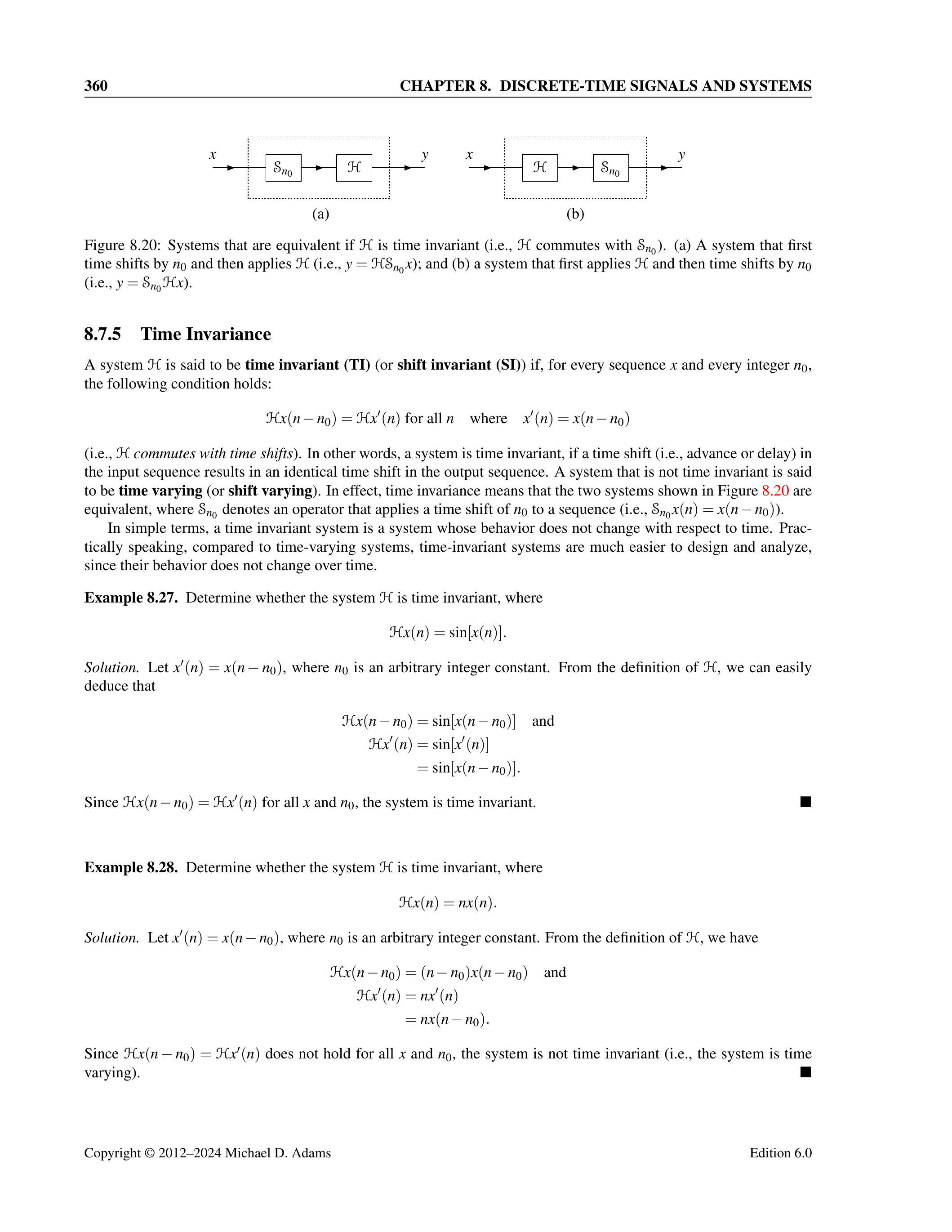 8.18 判断下列每个系统 \(\mathfrak{H}\) 是否为时间不变系统(time invariant)。