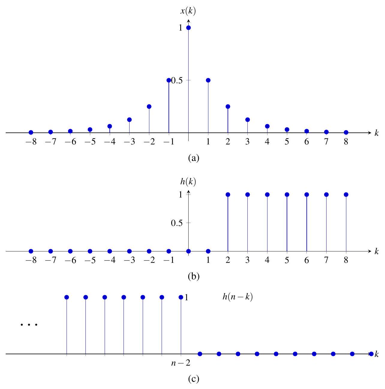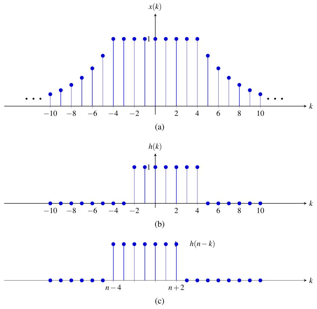 图 9.1:例 9.1 的图像。分别绘制了 (a) \(x(k)\),(b) \(h(k)\),和 (c) \(h(n-k)\) 关于 \(k\) 的图像。