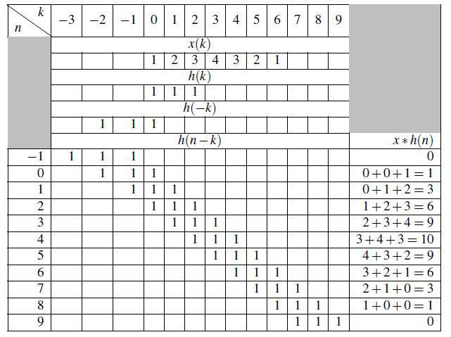 解答 该卷积最容易通过图解法或表格法进行。下面我们选择表格法。通过构建一张显示 \(x\) 以及 \(h\) 的各种时间反转和移位版本的表格,可以轻松计算 \(x * h\) 的各元素。该过程结果见表 9.1。从表中可得: