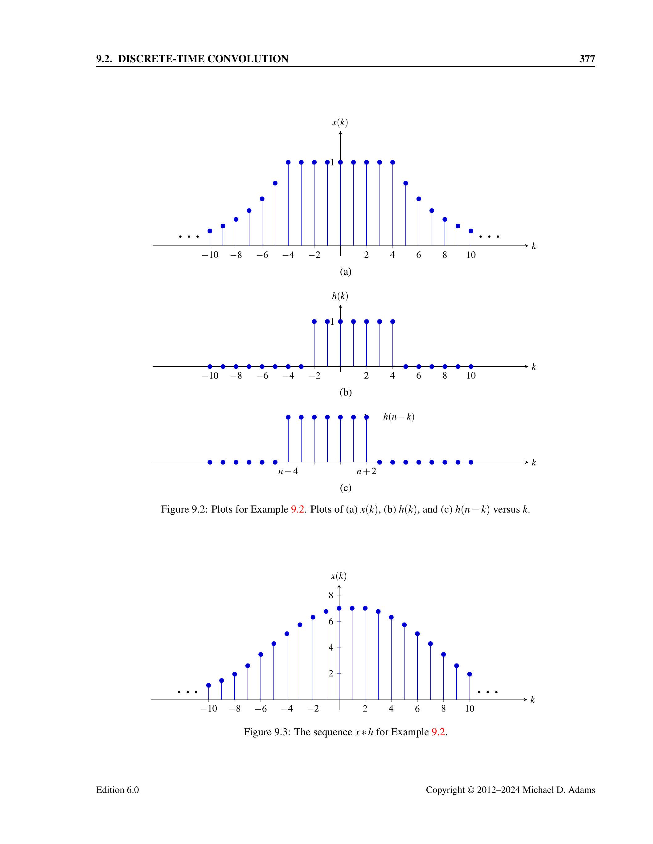 图 9.1:例 9.1 的图像。分别绘制了 (a) \(x(k)\),(b) \(h(k)\),和 (c) \(h(n-k)\) 关于 \(k\) 的图像。