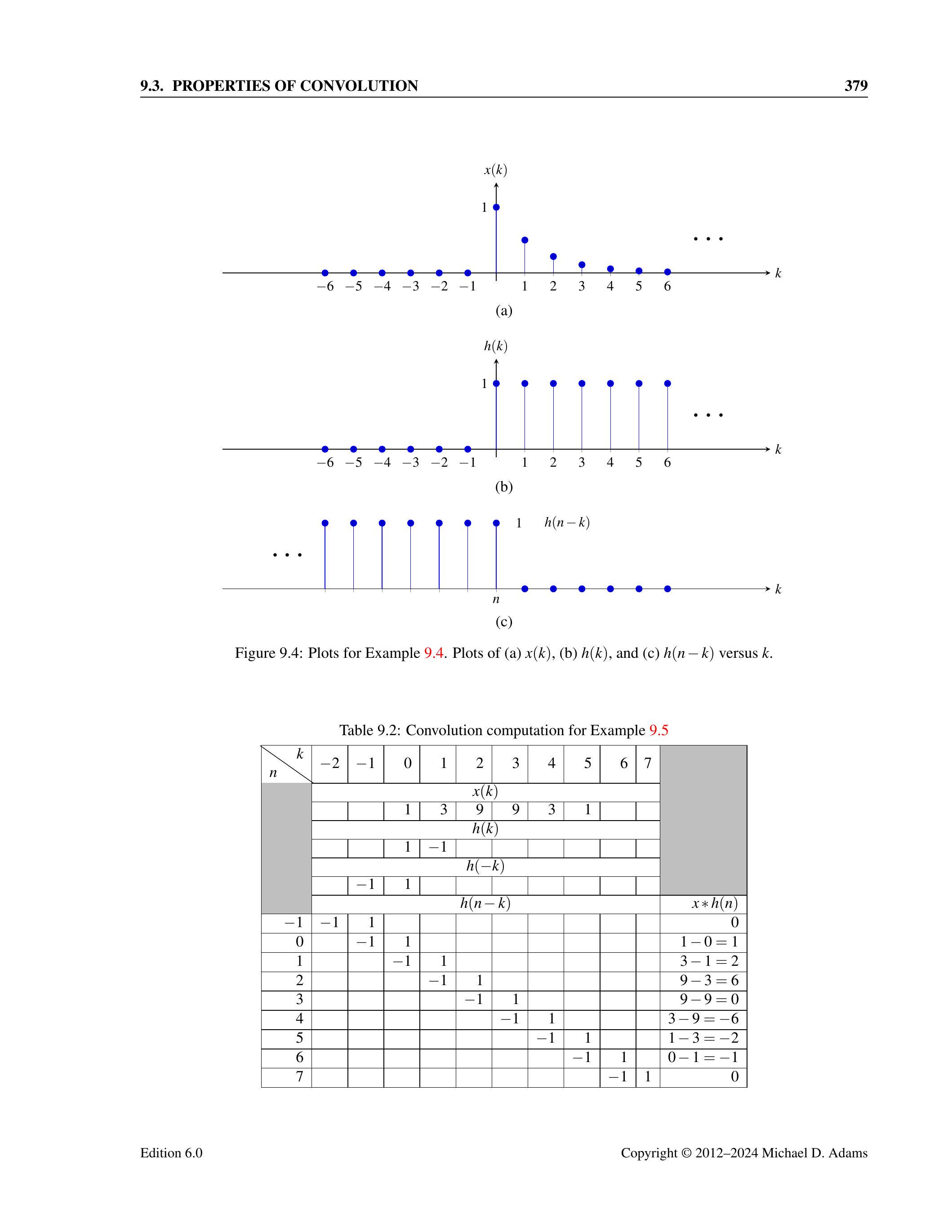 根据被卷积序列的形式,我们可以采用上述策略的多种变体。然而,在大多数情况下,绘制卷积运算中涉及的各序列的图像非常有帮助,因为这通常使答案的一般形式更易于直观理解。有时,从图像中得到的信息也可以更方便地以表格形式表示。因此,使用表格也很有帮助。下面,我们通过几个例子来说明卷积的计算方法。