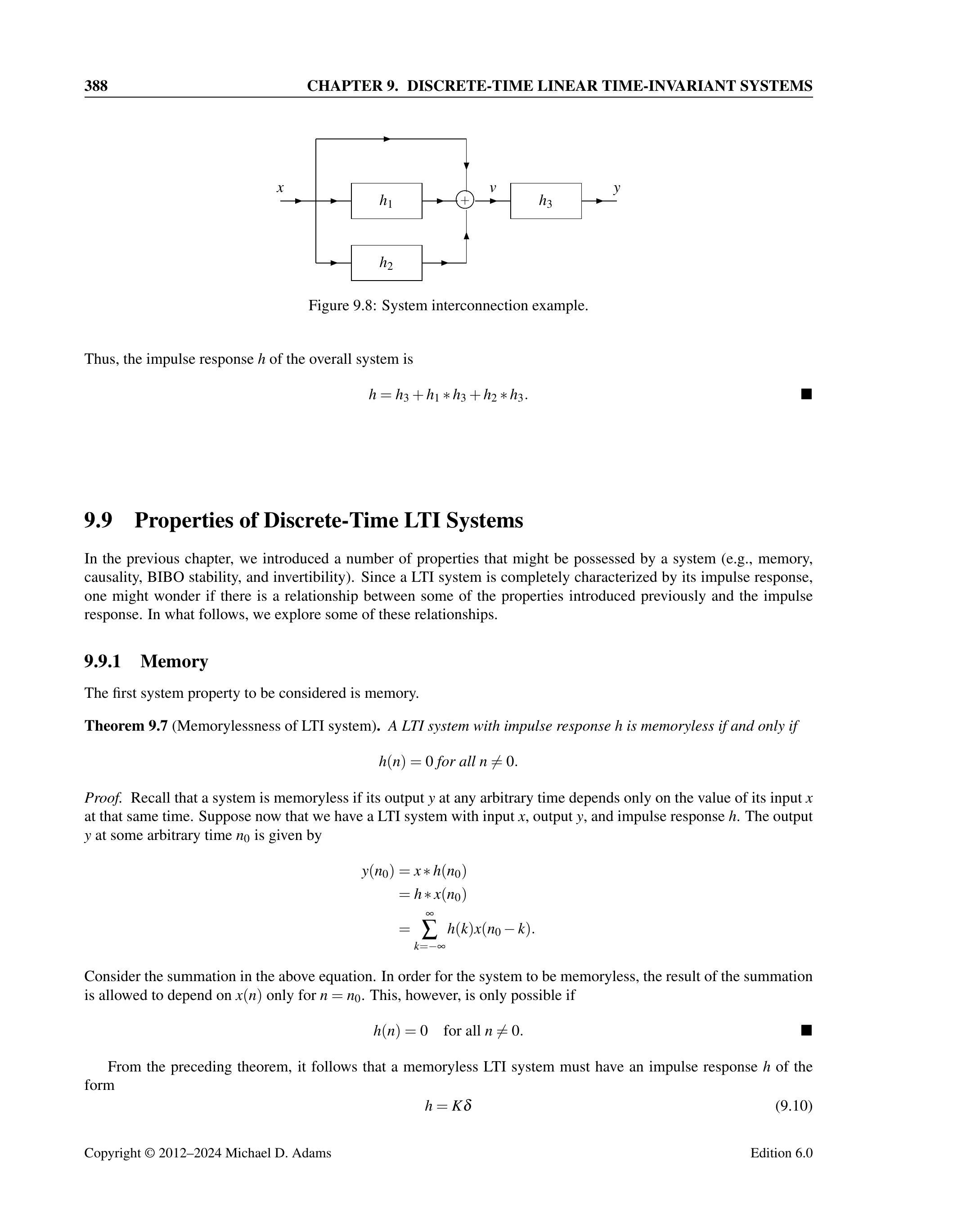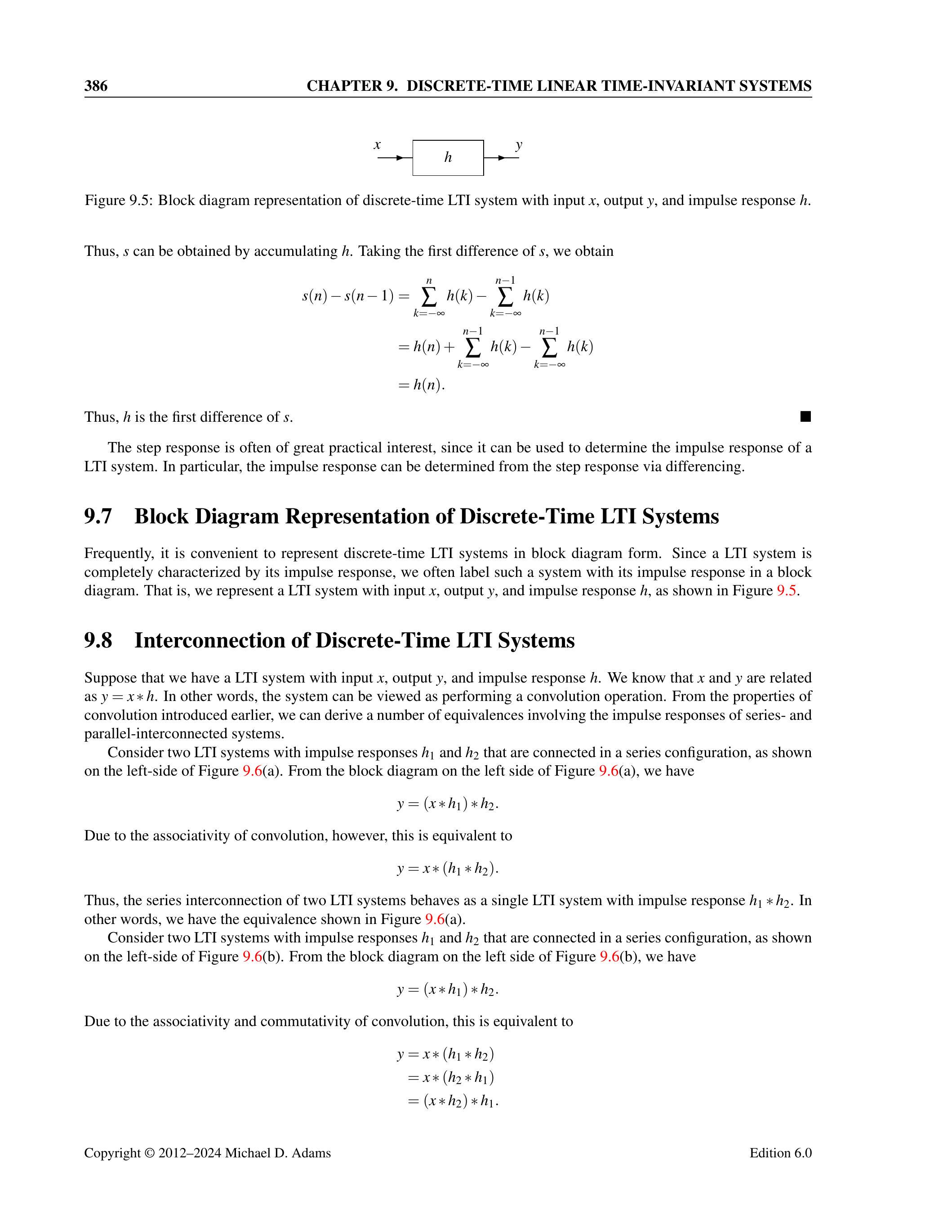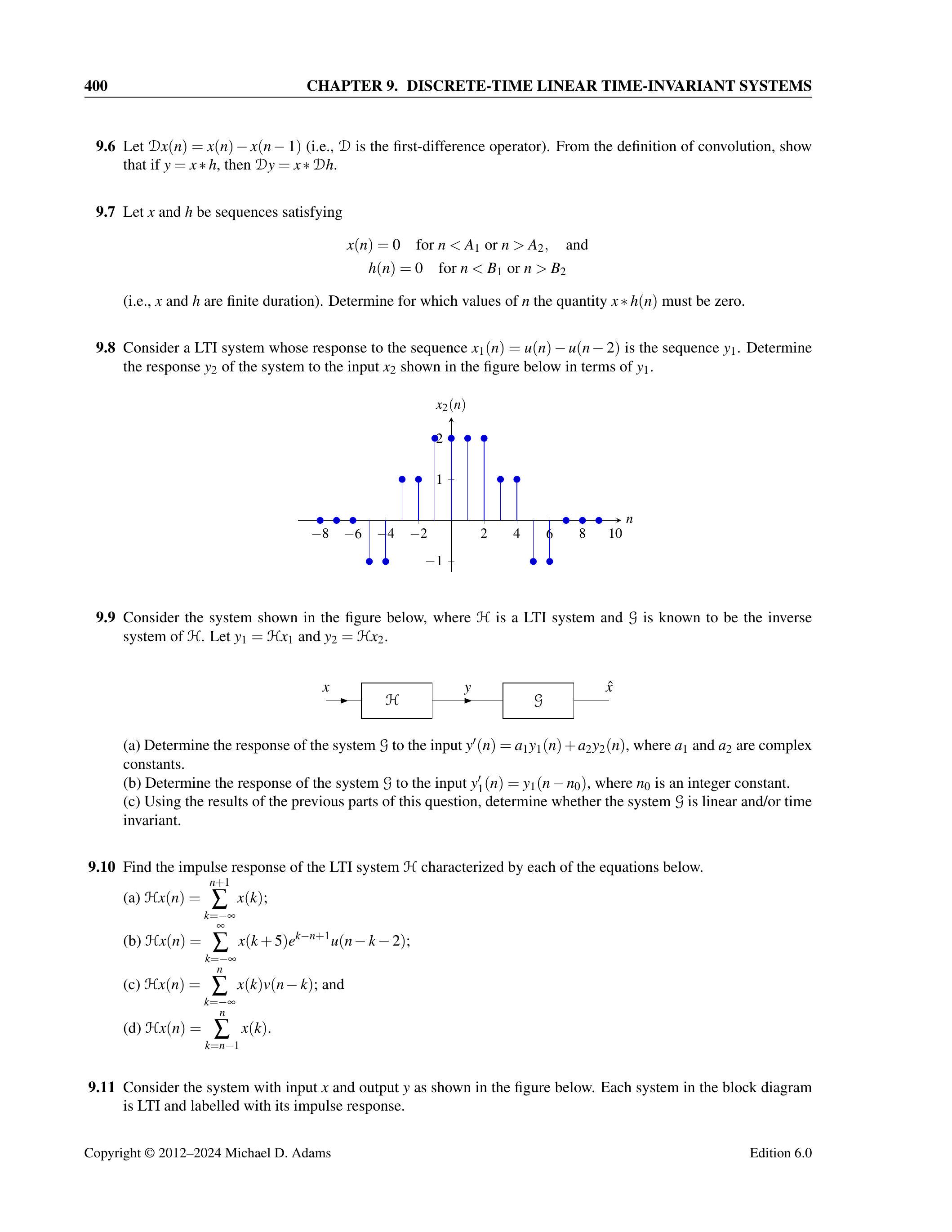 9.6 设 \(\mathcal{D} x(n) = x(n) - x(n-1)\)(即 \(\mathcal{D}\) 为一阶差分算子)。根据卷积定义,证明若 \(y = x * h\),则 \(\mathcal{D} y = x * \mathcal{D} h\)。