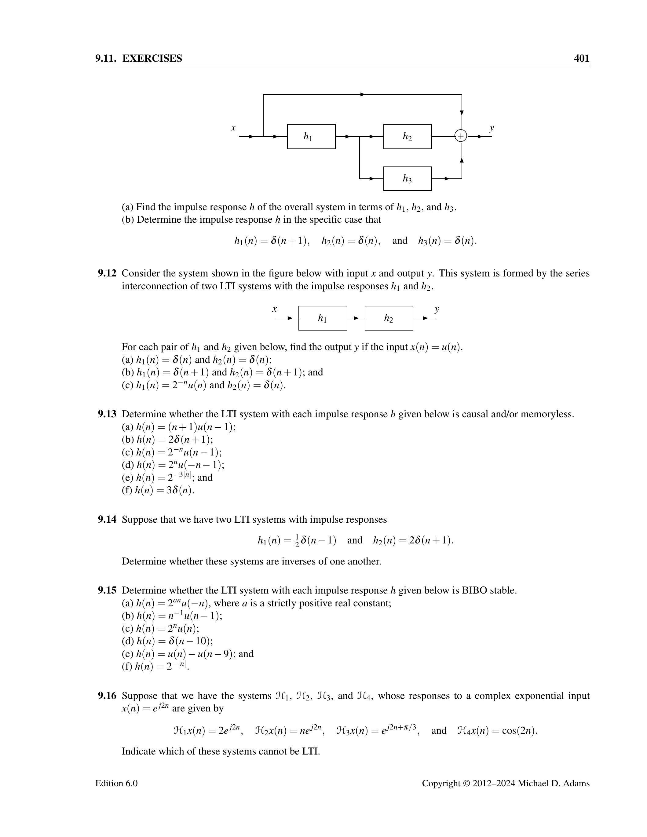 9.13 判断下列每个冲激响应 \(h\) 对应的 LTI 系统是否因果和/或无记忆。