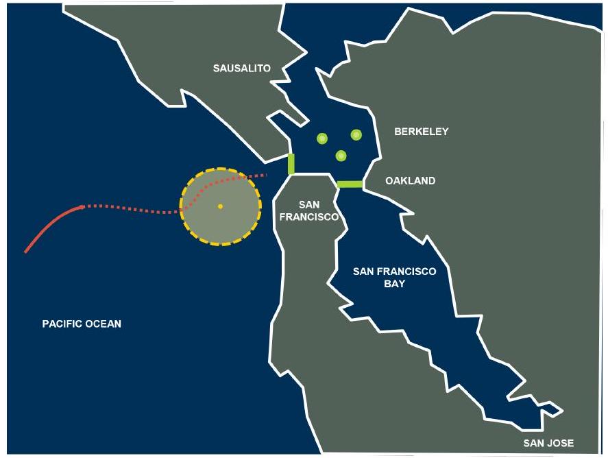图2. 旧金山USV攻击场景示意图。红线表示USV在二维地图上的航迹,黄色圆半径表示保护旧金山的传感器套件探测范围。绿色形状表示海湾中的友方资产。