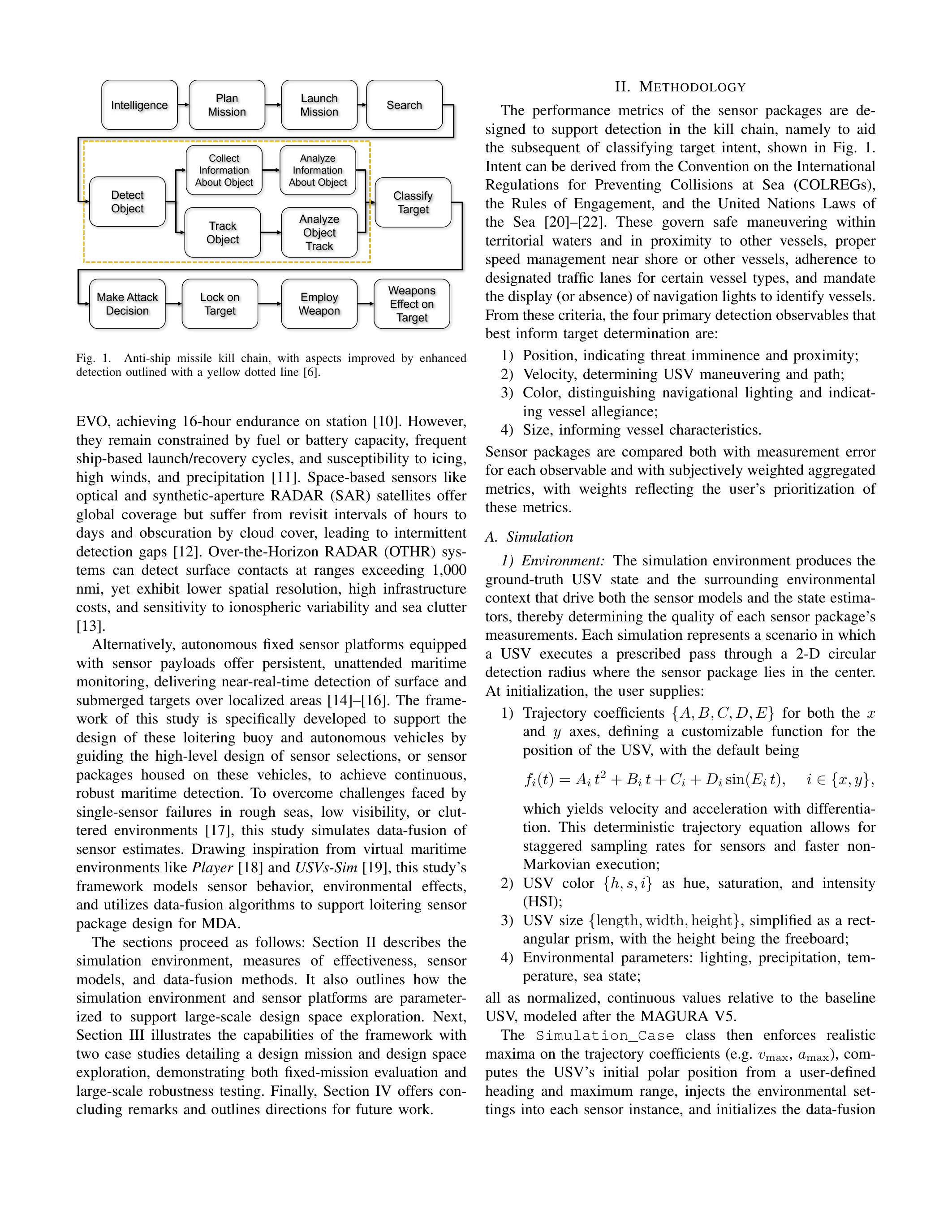 [1] Z. Zhang, X. Liang, C. Chen, D. Liu, C. Yu, and W. Li, "Defense penetration strategy for unmanned surface vehicle based on modified soft actor-critic," Ocean Engineering, vol. 304, p. 117840, 2024. [2] B. Du, B. Lin, C. Zhang, B. Dong, and W. Zhang, "Safe deep reinforcement learning-based adaptive control for usv interception mission," Ocean Engineering, vol. 246, p. 110477, 2022. [3] A. Abdurasulov. (2024, Mar) Ukraine war: The sea drones keeping russia's warships at bay. BBC News. Accessed July 2025. [Online]. Available: https://www.bbc.com/news/world-europe-68528761 [4] S. Brown. (2024, Mar) Analysis: The magura-v5 sea drone - scourge of russia's black sea operations. Kyiv Post. Accessed July 2025. [Online]. Available: https://www.kyivpost.com/analysis/29068 [5] R. P. Pedrozo, "Houthi maritime terrorism: Severing the iranian lifeline," International Law Studies, vol. 106, no. 1, 2025. [Online]. Available: https://digital-commons.usnwc.edu/ils/vol106/iss1/12/ [6] D. Mosier. (2018, Feb) Breaking the anti-ship missile kill chain. Center for International Maritime Security (CIMSEC). Accessed July 2025. [Online]. Available: https://cimsec.org/ breaking-anti-ship-missile-kill-chain/ [7] Y. Zhang, C. Pan, and X. Deng, "Complex network-based decisionmaking analysis of strikes on important nodes of a typical kill chain," in Advances in Swarm Intelligence, Y. Tan and Y. Shi, Eds. Singapore: Springer Nature Singapore, 2024, pp. 145-159. [8] B. Johnson, J. Green, G. Burns, T. Collier, R. Cornish, K. Curley, A. Freeman, and J. Spears, "Mapping artificial intelligence to the naval tactical kill chain," Naval Engineers Journal, vol. 135, pp. 155-166, 06 2023. [9] U.S. Coast Guard. (2025) Fast response cutter program profile. Accessed July 2025. [Online]. Available: https://www.dcms.uscg. mil/Our-Organization/Assistant-Commandant-for-Acquisitions-CG-9/ Programs/Surface-Programs/Fast-Response-Cutters/ [10] S. Bauk, N. Kapidani, L. Sousa, Z. Lukšič, and A. Spuza, "Advantages and disadvantages of some unmanned aerial vehicles deployed in maritime surveillance," Journal of Maritime Research, vol. XVII, no. III, pp. 81-87, 2020. [11] R. Hann and T. A. Johansen, "Unsettled topics in unmanned aerial vehicle icing," SAE International, Warrendale, PA, SAE EDGE Research Report EPR2020008, Apr 2020. [12] R. Sandau, K. Brieß, and M. D'Errico, "Small satellites for global coverage: Potential and limits," ISPRS Journal of Photogrammetry and Remote Sensing, vol. 65, no. 6, pp. 492-504, 2010. [13] R. J. Riddolls, "A canadian perspective on high-frequency over-thehorizon radar," Defence Research and Development Canada - Ottawa, Ottawa, Ontario, Canada, Technical Memorandum DRDC Ottawa TM 2006-285, Dec 2006. [14] J. Karst, R. McGurrin, K. Gavin, J. Luttrell, W. Rippy, R. Coniglione, J. McKenna, and R. Riedel, "Enhancing maritime domain awareness through ai-enabled acoustic buoys for real-time detection and tracking of fast-moving vessels," Sensors, vol. 25, no. 6, p. 1930, 2025. [15] Fraunhofer IOSB, "Practical results for buoy-based automatic maritime ir-video surveillance," in Proceedings of the Port and Regional Maritime Security Symposium (RTO-MP-SCI-247). La Spezia, Italy: NATO Science and Technology Organization, May 2012, pp. 20/1-20/12. [16] S. Fefilatyev, D. Goldgof, M. Shreve, and C. Lembke, "Detection and tracking of ships in open sea with rapidly moving buoy-mounted camera system," Ocean Engineering, vol. 54, pp. 1-12, 2012. [17] W. Liu, Y. Liu, B. A. Gunawan, and R. Bucknall, "Practical moving target detection in maritime environments using fuzzy multi-sensor data fusion," International Journal of Fuzzy Systems, vol. 23, no. 6, pp. 18601878, 2021. [18] A. Luis Bustamante, J. M. Molina López, and J. García Herrero, "Player: An open source tool to simulate complex maritime environments to evaluate data fusion performance," Simulation Modelling Practice and Theory, vol. 76, pp. 3-21, 2017. [19] W. Wang, H. Zhang, Y. Li, Z. Zhang, X. Luo, and S. Xie, "Usvs-sim: A general simulation platform for unmanned surface vessels autonomous learning," Concurrency and Computation: Practice and Experience, vol. 34, no. 3, p. e6567, 2022, accessed July 2025. [20] International Maritime Organization, Convention on the International Regulations for Preventing Collisions at Sea, 1972 (COLREGs), United Nations Std., 1972, accessed July 2025. [Online]. Available: https://www.imo.org/en/About/Conventions/Pages/COLREG.aspx [21] J. A. Roach, "Rules of engagement," Naval War College Review, 1983. [Online]. Available: https://digital-commons.usnwc.edu/nwc-review/ vol36/iss1/6 [22] United Nations, United Nations Convention on the Law of the Sea, United Nations Std., 1994. [Online]. Available: https://www.un.org/ depts/los/convention_agreements/texts/unclos/unclos_e.pdf [23] M. D. McKay, R. J. Beckman, and W. J. Conover, "A comparison of three methods for selecting values of input variables in the analysis of output from a computer code," Technometrics, vol. 21, no. 2, pp. 239245, 1979. [24] G. Quartly, M. Srokosz, and T. Guymer, "Understanding the effects of rain on radar altimeter waveforms," Advances in Space Research, vol. 22, no. 11, pp. 1567-1570, 1998. [25] A. Huntington and J. Williams, George M., "Lidar effective range," Allegro MicroSystems, Technical Document P0177, 2025, accessed July 2025. [Online]. Available: https://www.allegromicro.com/en/insights-and-innovations/ technical-documents/p0177-LiDAR-effective-range [26] J. Johnson, "Analysis of image forming systems," in Proceedings of the Image Intensifier Symposium, ser. Tech. Rep. AD220160. Fort Belvoir, VA: U.S. Army Engineer Research and Development Laboratories (ERDL), Oct 1958, pp. 244-273. [27] S. Zainuddin, I. P. Ibrahim, N. E. A. Rashid, M. N. Zaiaami, A. M. Md Noor, M. S. A. M. Ali, and R. S. A. R. Abdullah, "Maritime radar: A review on techniques for small vessels detection," Int. J. Electrical and Electronic Systems Research, vol. 14, pp. 1-16, 2019. 