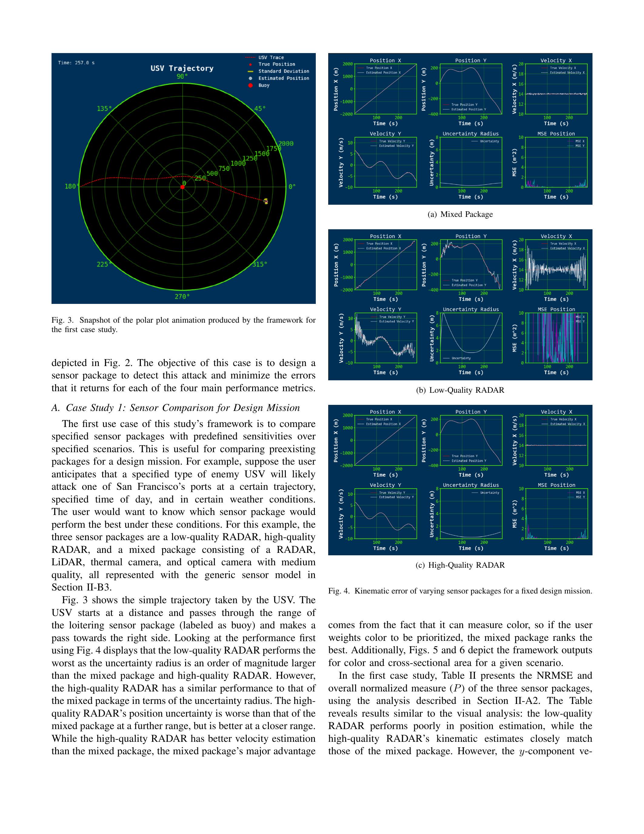 本研究框架的第一个应用案例是比较在特定场景下具有预定义灵敏度的传感器套件。这对于比较现有的传感器套件在设计任务中的表现非常有用。举例来说,假设用户预测某类敌方USV将在特定航迹、特定时间、特定天气条件下攻击旧金山的港口。用户会希望知道哪种传感器套件在这些条件下表现最佳。该示例中选择的三种传感器套件为:低质量雷达(RADAR)、高质量雷达,以及一个混合套件(由雷达、激光雷达、热成像相机与光学相机组成,质量为中等),三者均通过II-B3节中的通用传感器模型表示。