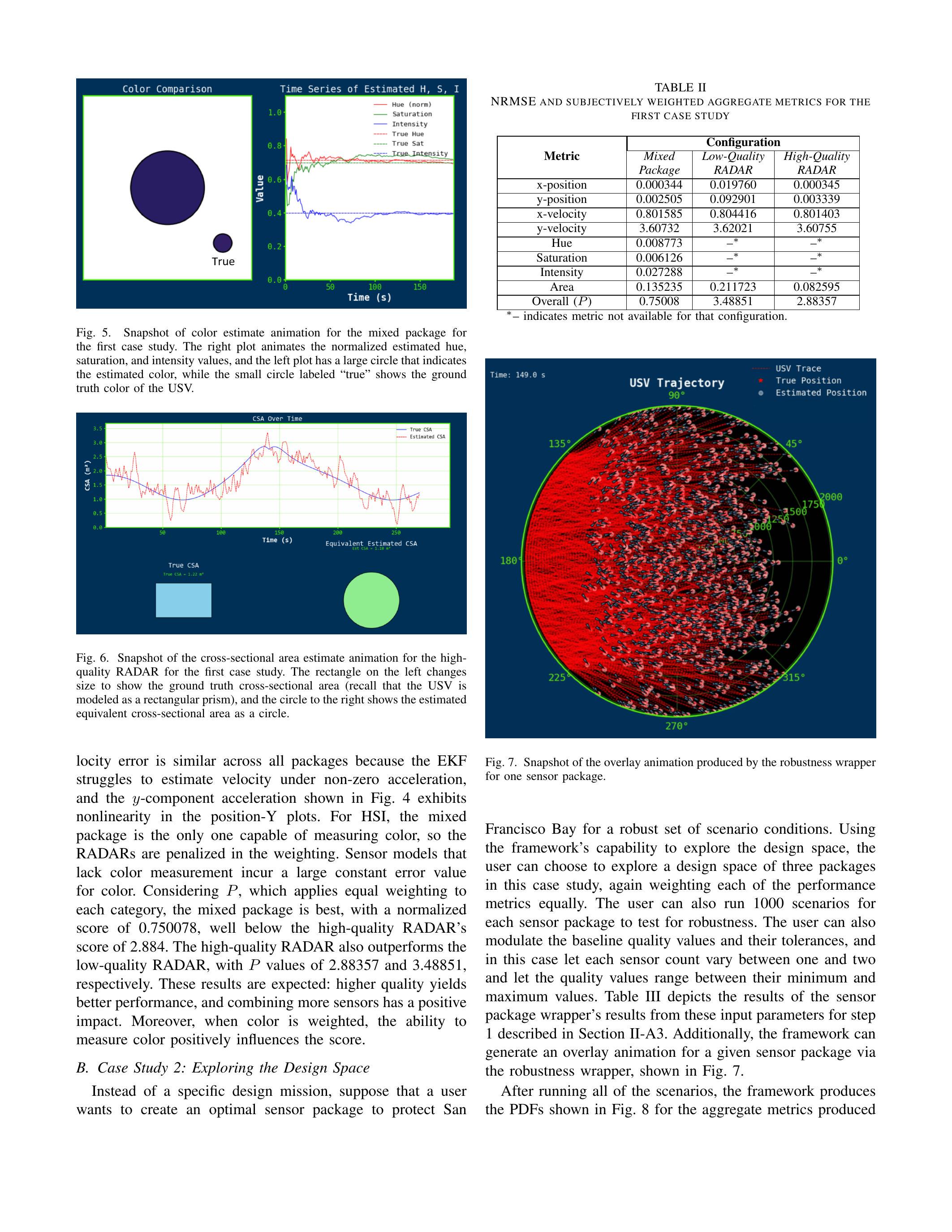 在第一个案例研究中,表II展示了三种传感器套件的NRMSE与整体归一化指标\((P)\),计算方法见II-A2节。表格结果与可视化分析一致:低质量雷达在位置估计上表现较差,而高质量雷达的运动学估计与混合套件非常接近。然而,由于EKF在非零加速度条件下难以估计速度,因此所有套件在\(y\)方向速度上的误差相似,图4中的\(y\)方向加速度曲线在位置-Y图中表现出非线性。对于HSI,只有混合套件能够测量颜色,因此雷达在权重计算中受到惩罚。缺少颜色测量的传感器模型在颜色维度上会产生一个大的常量误差值。考虑到\(P\)指标(对每个类别等权重处理),混合套件的表现最佳,归一化得分为0.750078,显著低于高质量雷达的2.884。高质量雷达的表现也优于低质量雷达,其\(P\)值分别为2.88357与3.48851。这些结果符合预期:更高质量带来更好表现,而传感器的组合能带来正面效果。此外,当颜色被赋予权重时,能测量颜色的能力会进一步提升得分。
