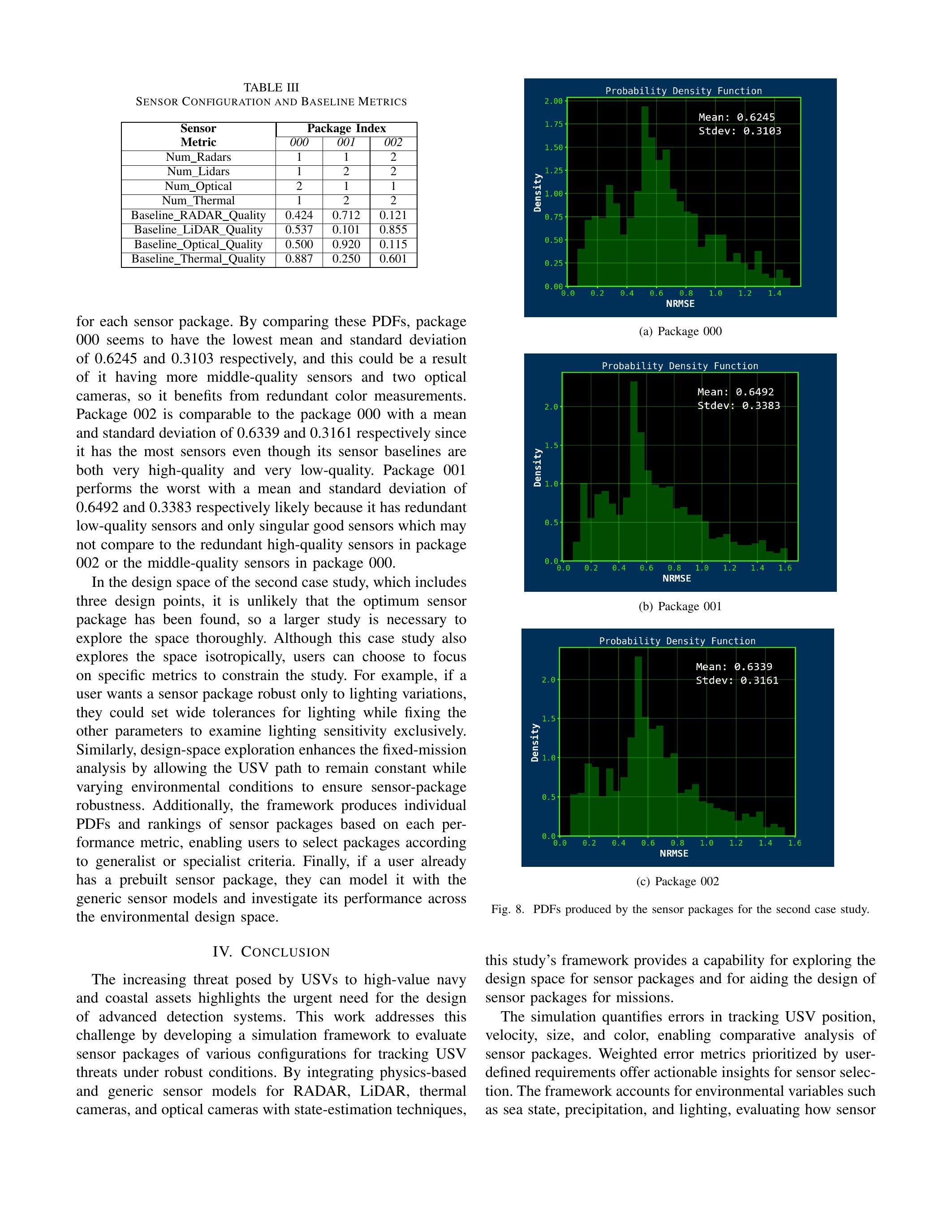 在运行完所有场景后,框架会生成每个传感器套件综合指标的PDF分布,如图8所示。比较这些PDF可见:套件000的均值和标准差分别为0.6245与0.3103,最低,因此更优,可能原因是它包含更多中等质量传感器及两个光学相机,从而受益于冗余的颜色测量。套件002的表现与000相近,均值和标准差分别为0.6339与0.3161,尽管它同时包含非常高质量和非常低质量的传感器,但传感器数量最多。套件001表现最差,其均值与标准差分别为0.6492与0.3383,原因可能是它包含冗余的低质量传感器,仅有少量高质量传感器,不及套件002的冗余高质量传感器或套件000的中等质量传感器组合。