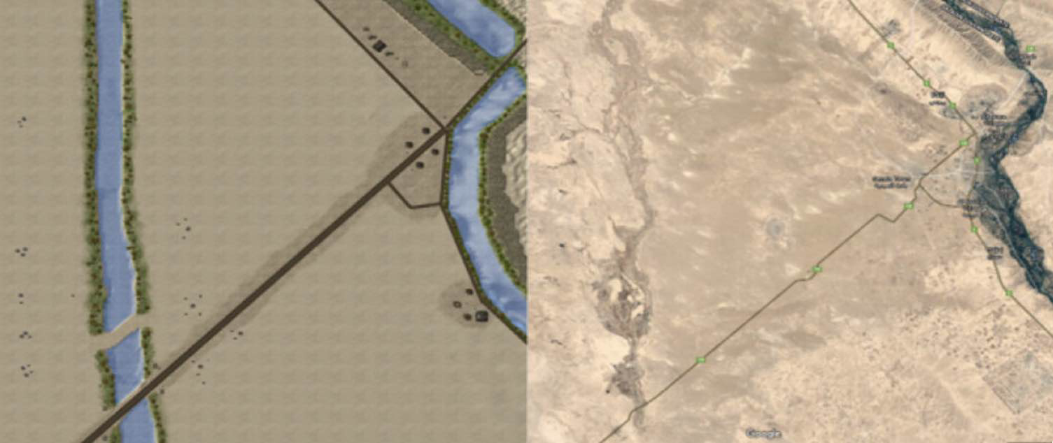我们使用 StarCraft II 编辑器为 TigerClaw 场景创建了新的 Melee Map。地图尺寸为可用最大规格 256×256 瓦片,采用 StarCraft II 坐标系统。默认地表采用荒地(wasteland)瓦片集,以在视觉上接近 TigerClaw 作战区域的沙漠地形,如图 3 所示。在初始设置完成后,我们使用地形工具对地图进行修改,使其在一定程度上近似真实作战区域。关键地形特征是不可通行的干涸河道,仅在有限位置可通过。