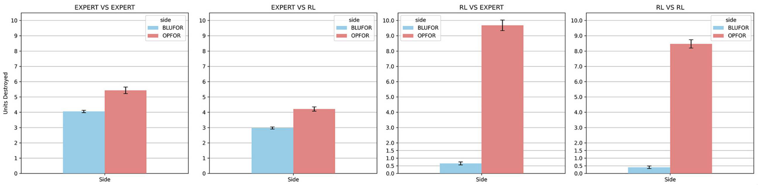策略网络在高性能计算系统上进行训练,使用 39 个并行工作进程,在 44 小时内收集了 212,000 场仿真战斗。训练模型在某一检查点冻结策略后进行 100 次 rollout 仿真评估,此时蓝军策略的滚动平均奖励为 195,红军为 -317。图 8 提供了 100 次 rollout 仿真中条令规则型与 RL 型指挥员的对比分析结果。结果显示,在与规则型指挥员对抗时,RL 型指挥员能够降低自身伤亡(见 EXPERT 对 RL 与 RL 对 EXPERT 图)。与条令基线相比,兵力更强的蓝军 RL 指挥员将蓝军平均伤亡从约 4 降至 0.4,并将红军伤亡从 5.4 提高至 8.4。该结果通过采用仅与装甲连与战斗步兵连交战的策略实现。蓝军 RL 指挥员学会利用其最具杀伤力的 Abrams 与 Bradley 车辆,同时避免脆弱资产与红军交战,如图 9 所示为一次 rollout 开始与结束的快照。