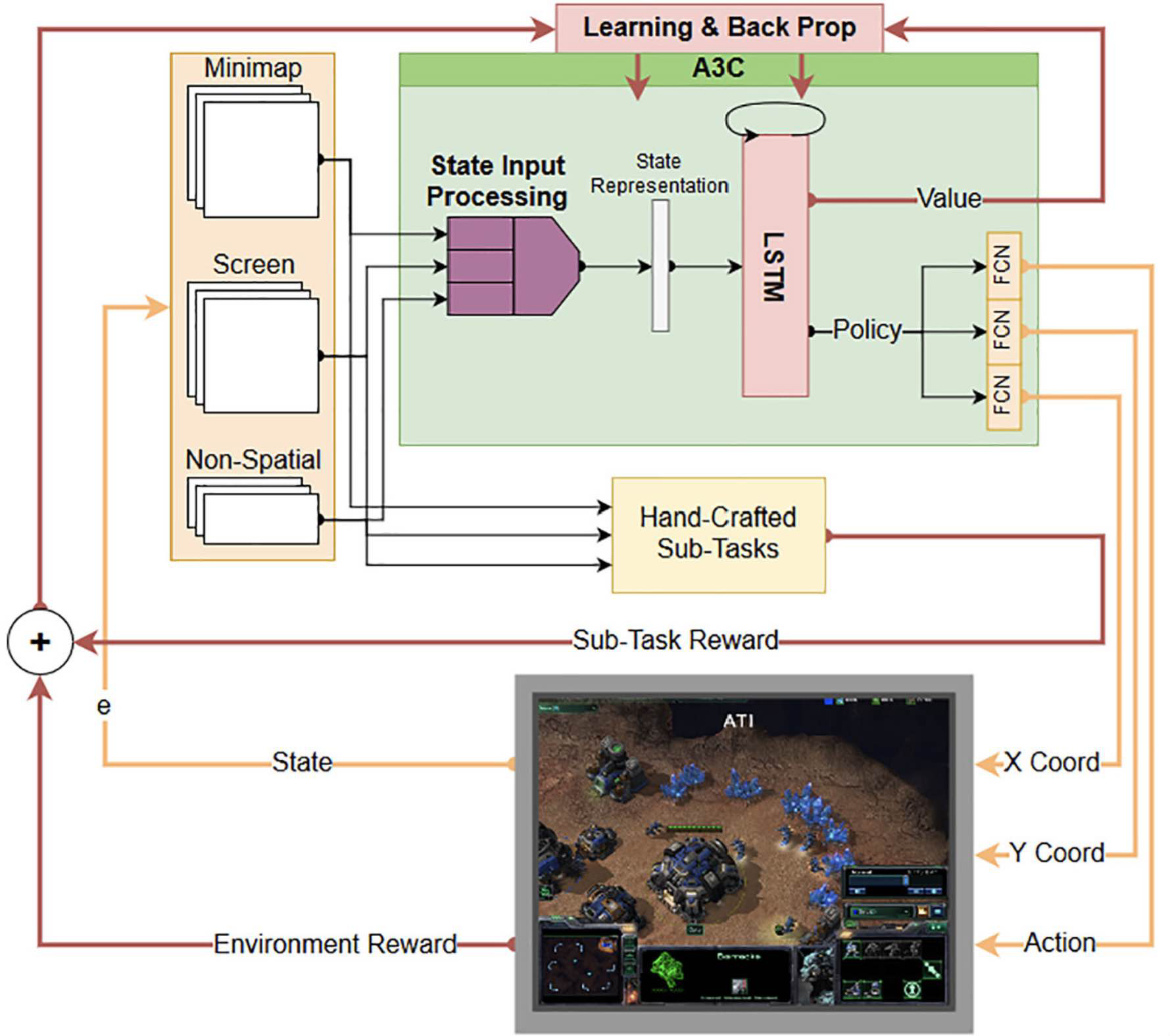 Figure 6. 完整 A3C 强化学习智能体及其与代表 TigerClaw 场景的 StarCraft II 环境连接的示意图。