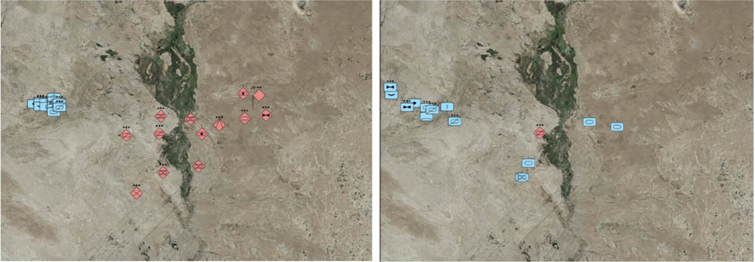 Figure 9. OpSim 中 RL 型指挥员一次 rollout 的开始(左)与结束(右)画面,展示蓝军学习到仅以最具杀伤力单位交战并保护脆弱资产的策略。