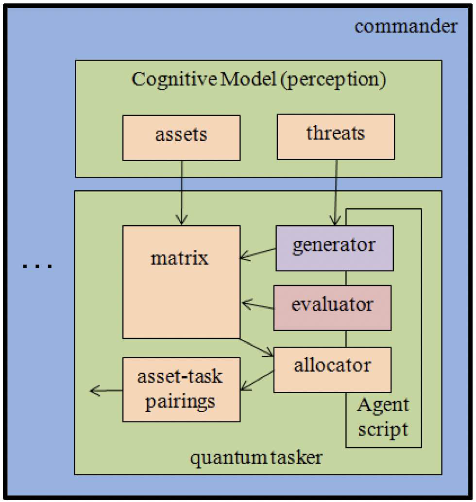 RIPR Quantum Tasker 用于指挥官下属互动和任务冲突消除。 Quantum Tasker 包括任务生成器、任务-资产对评估器、分配算法和各种策略设置(例如如何处理被拒绝的任务分配)。 每个组件(生成器、评估器、分配器)都可以从预定义选项中选择,或在脚本中自定义创建。 RIPR Quantum Tasker 任务分配系统还与使用旧任务管理器(WSF_TASK_MANAGER 和 WSF_TASK_PROCESSOR)的平台兼容。 它可以向/从其他 RIPR 代理和其他任务管理器平台发送和/或接收任务。 图 3 说明了 Quantum Tasker 的各个部分及其连接。