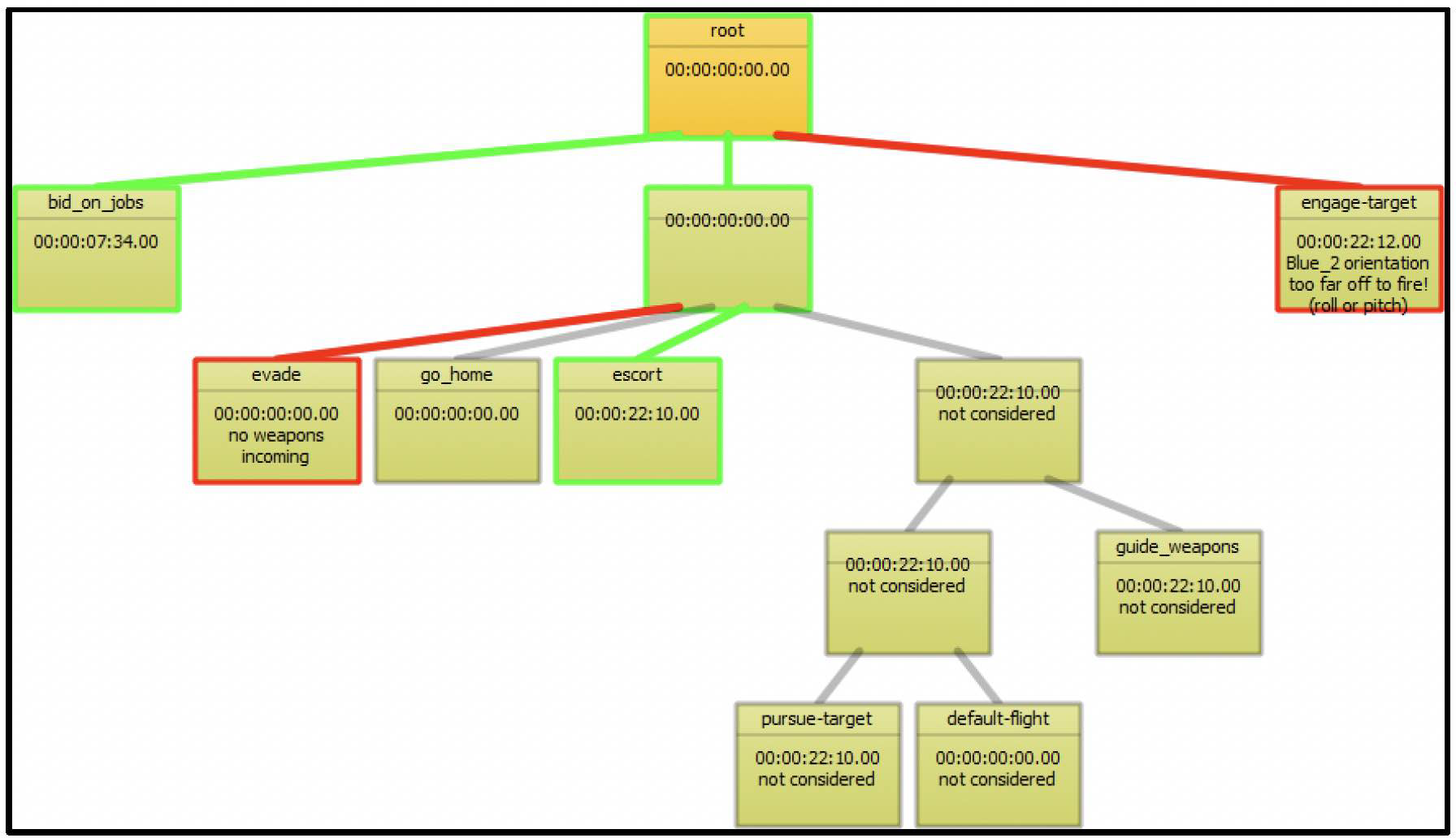 行为树为开发和编辑代理提供了最大的效用。 正确构造的行为树允许用户快速找到相关脚本,并在适当的地方交换其他行为。 例如:尝试将选择所需航向、高度和速度的行为与实际执行飞行任务的行为分开。 当你发展出一种新的飞行行为时,例如 一个使用新路线查找器的人,您可以将其换成旧路线查找器,同时保持用于计算所需方向的逻辑。