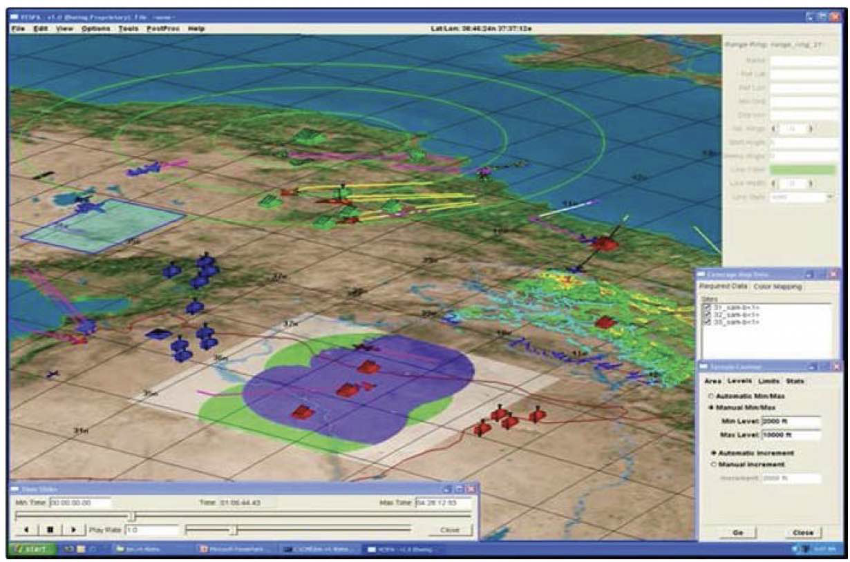 为了支持分析师,波音开发了工具以方便场景生成和后处理数据分析与可视化。具体而言,开发了视觉环境场景准备和分析(VESPA)软件应用程序,以支持创建与任何基于AFSIM的应用程序兼容的场景初始条件文件。此外,VESPA还可用于可视化由任何基于AFSIM的应用程序生成的对象位置时间历史和其他事件信息。这使分析师能够快速理解并分析仿真输出。由于VESPA是一个“DIS侦听器”可视化工具,它还可用于显示任何实时仿真发布的DIS数据的实时实体交互。