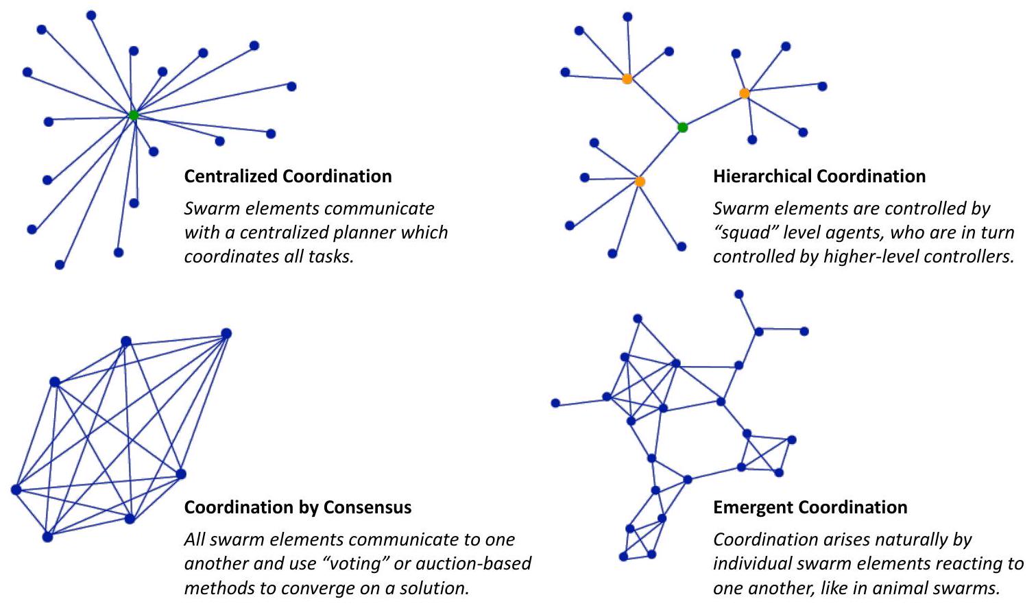 人们研究了蜂群的不同方面,试图回答诸如“我们如何控制蜂群?”以及“在不同蜂群控制策略中,哪种是最优?”等问题。对于后者,答案显然是视情况而定!如图1所示,存在多种控制策略,可能对不同场景表现出不同适用性。使用涌现协调的蜂群在攻击任务中更具韧性——当遭受敌方火力时能够实现优雅退化——而使用集中协调的蜂群则容易被一击致命(敌方只需摧毁领头无人机即能消灭整个蜂群)。但我们如何确定采用涌现协调实现进攻行动的蜂群是否可行?如果可行,这是否比其他方式更有利?