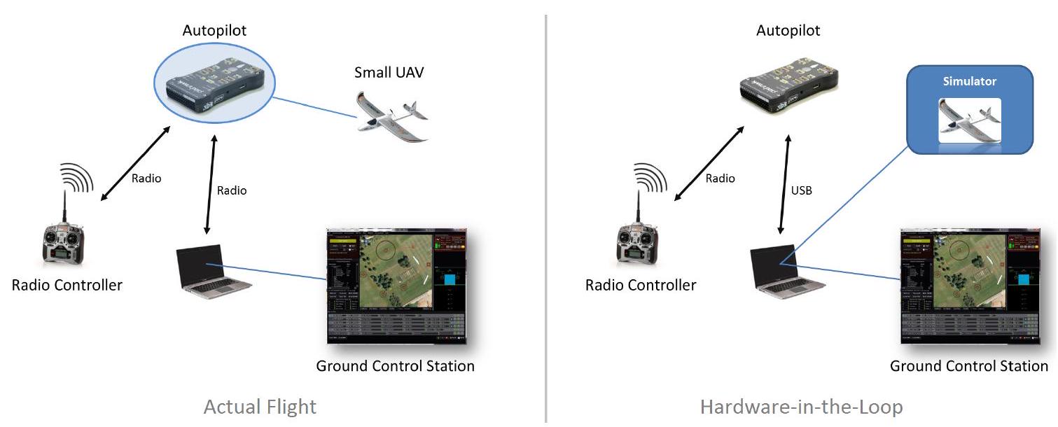 图4. 硬件在环。左图显示了业余社区典型的无人机控制设置——操作者通过无线电提供手动RC输入,同时通过GCS(均经无线电)发送指令和更新参数。右图中,操作者以同样方式控制仿真飞行器,但嵌入式系统(即硬件自动驾驶仪)通过串口/USB连接与仿真器通信,GCS作为两者间的接口。